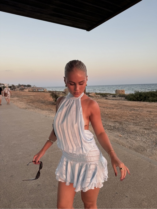 White long dress, slit at the back.