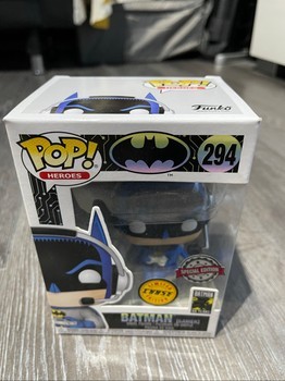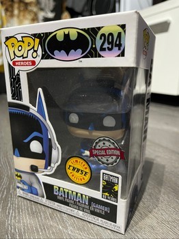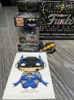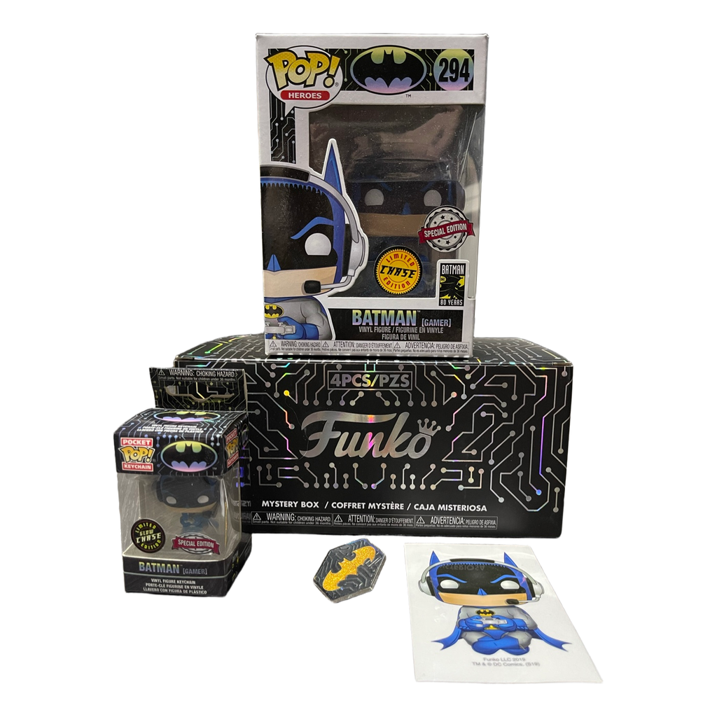 Funko Pop Batman Gamer collectible set includes a figure, a keychain, a pin and a sticker. Original GameStop box.