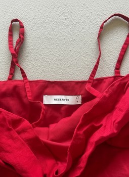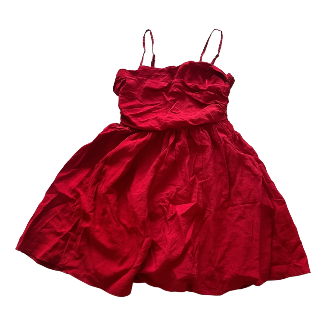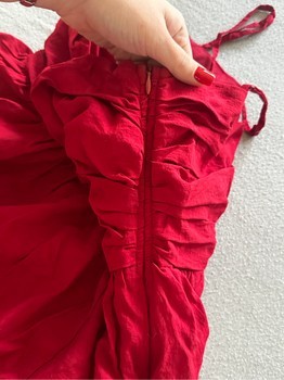 Sleeveless red dress with ruched bodice and thin adjustable straps. Size M.