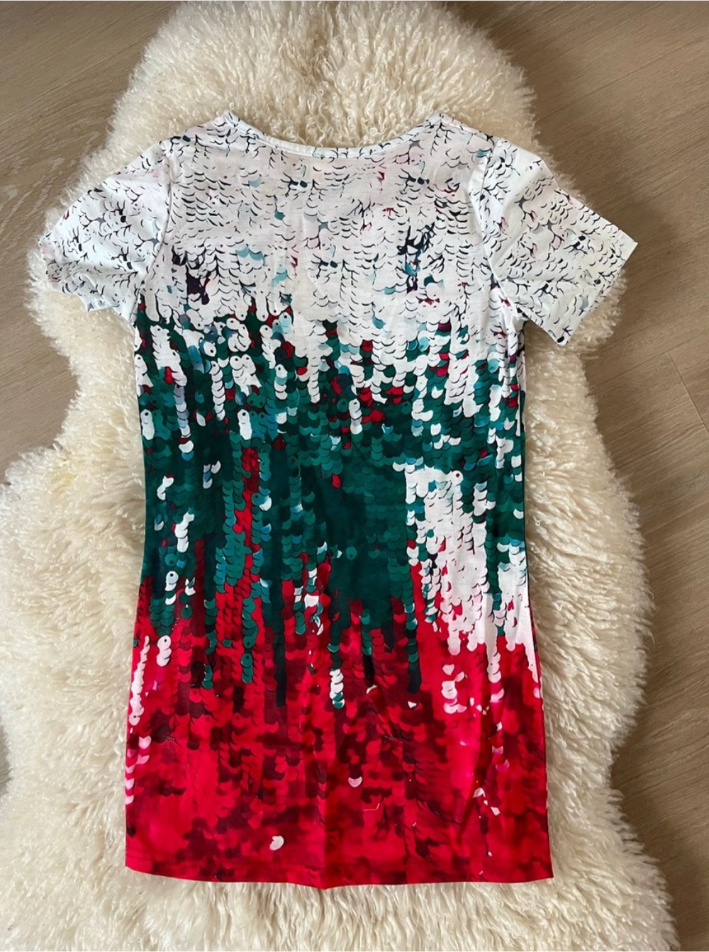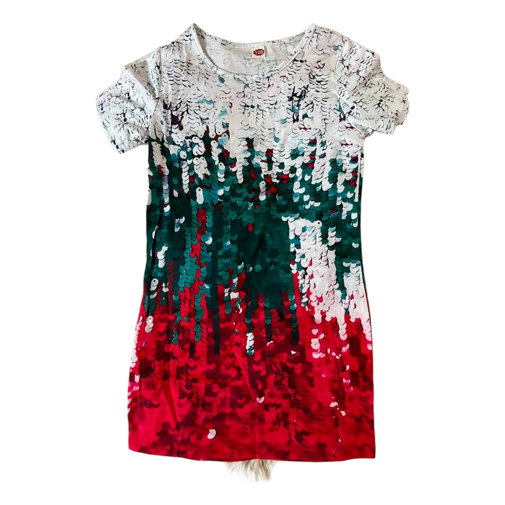 Lühikese varrukaga kleit värvilise mustriga. Suurus 120.