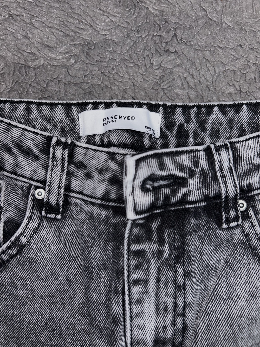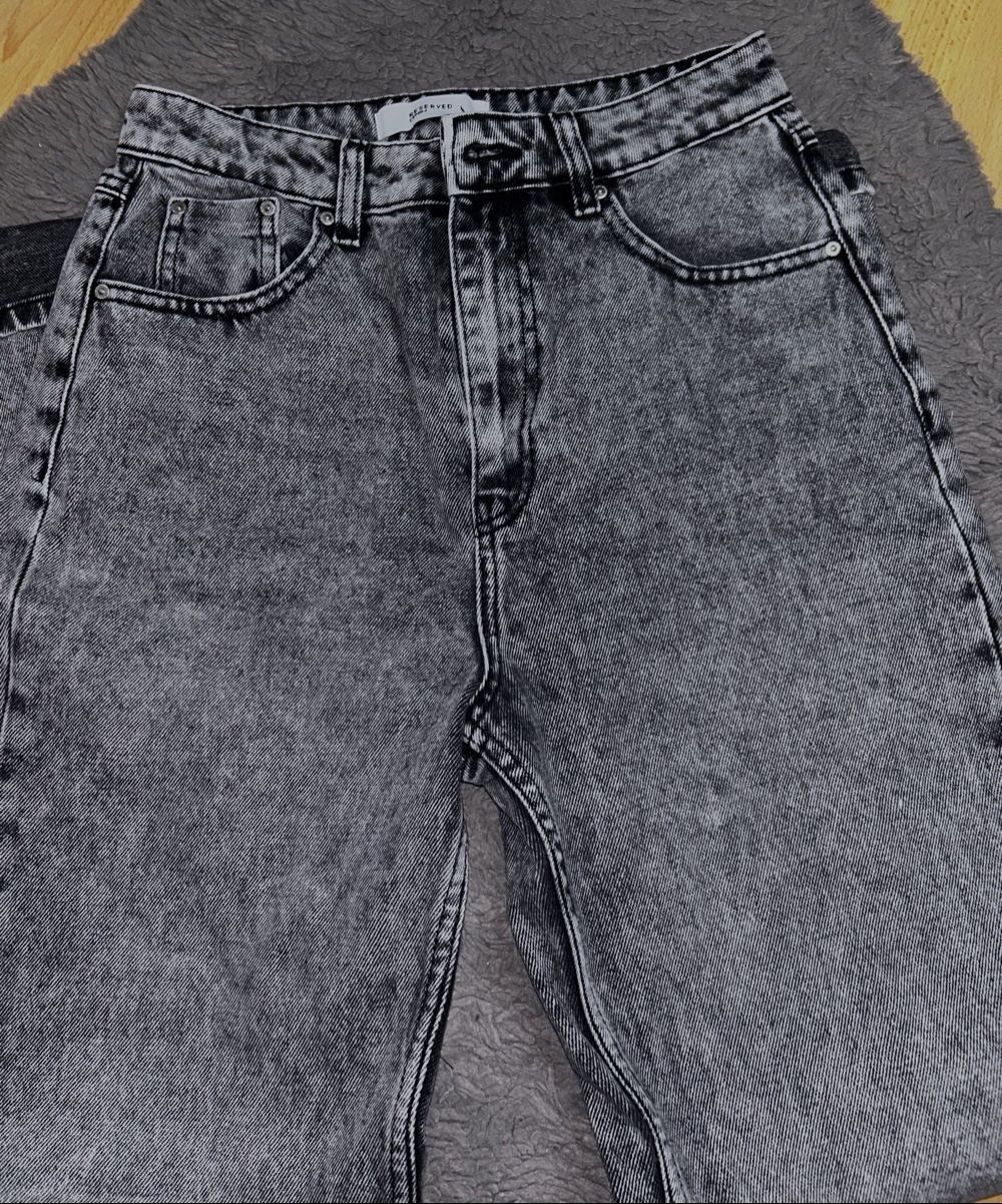 Acid wash denim jeans in grey. Featuring a button closure and classic pocket design. Size 36.