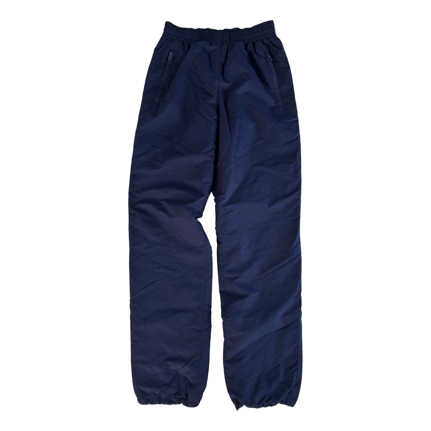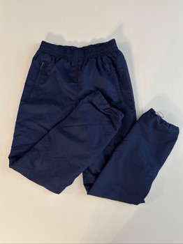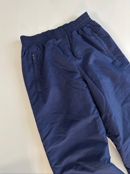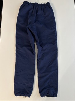 Padded pants. Blue outer surface and black lining inside. Warm. Drawstrings at the waist on the inside edge of the waist and tightening option on both legs. Zippered pockets at the front on both sides.