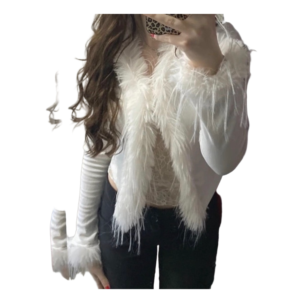 White long-sleeved cardigan featuring faux feather trim along the front opening and cuffs.