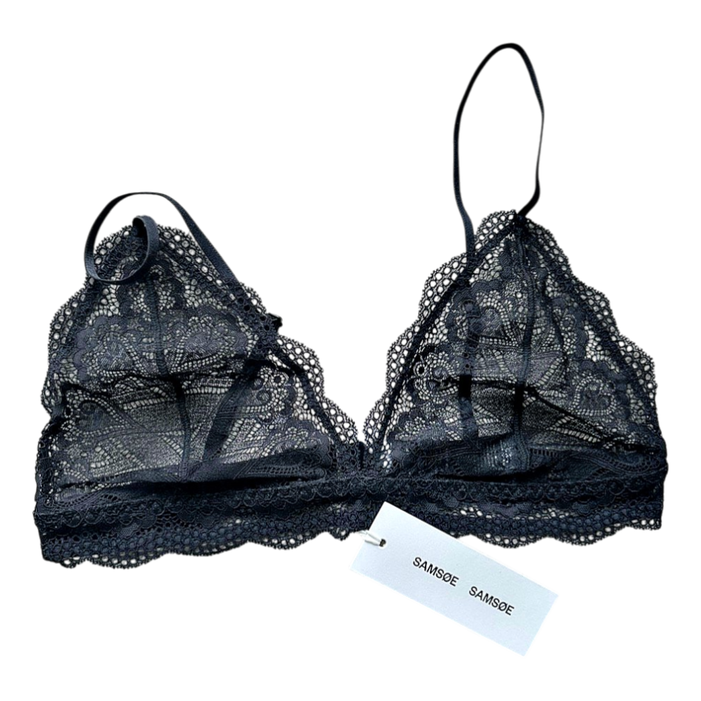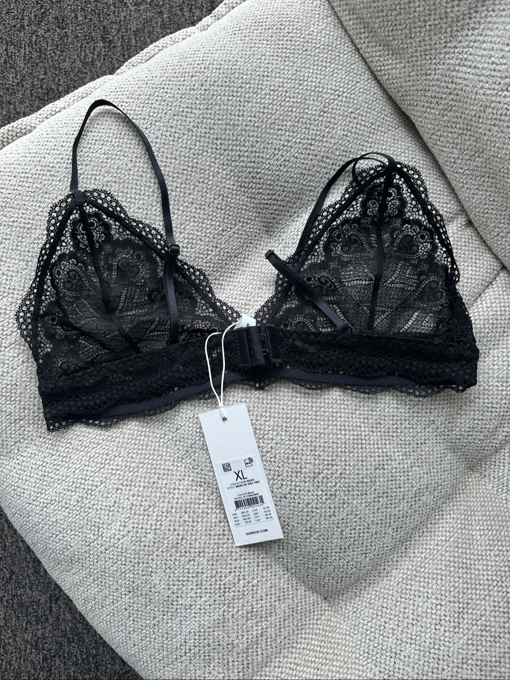Black lace bralette with adjustable straps. Features a hook-and-eye closure at the back. New with tags.