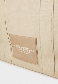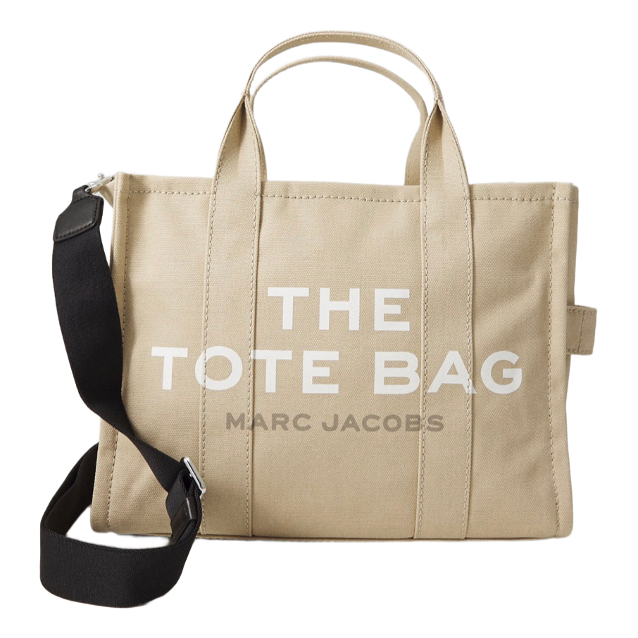 Medium Beige canvas tote bag with black detachable strap. Features the iconic Marc Jacobs branding on the front.