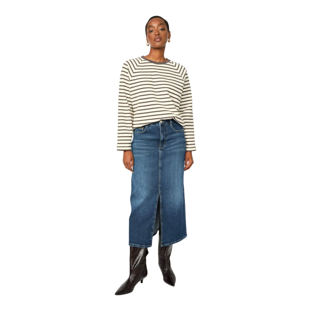 More information and the model's size chart here: https://mosmosh.com/products/mmmella-denim-skirt-dark-blue