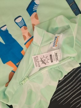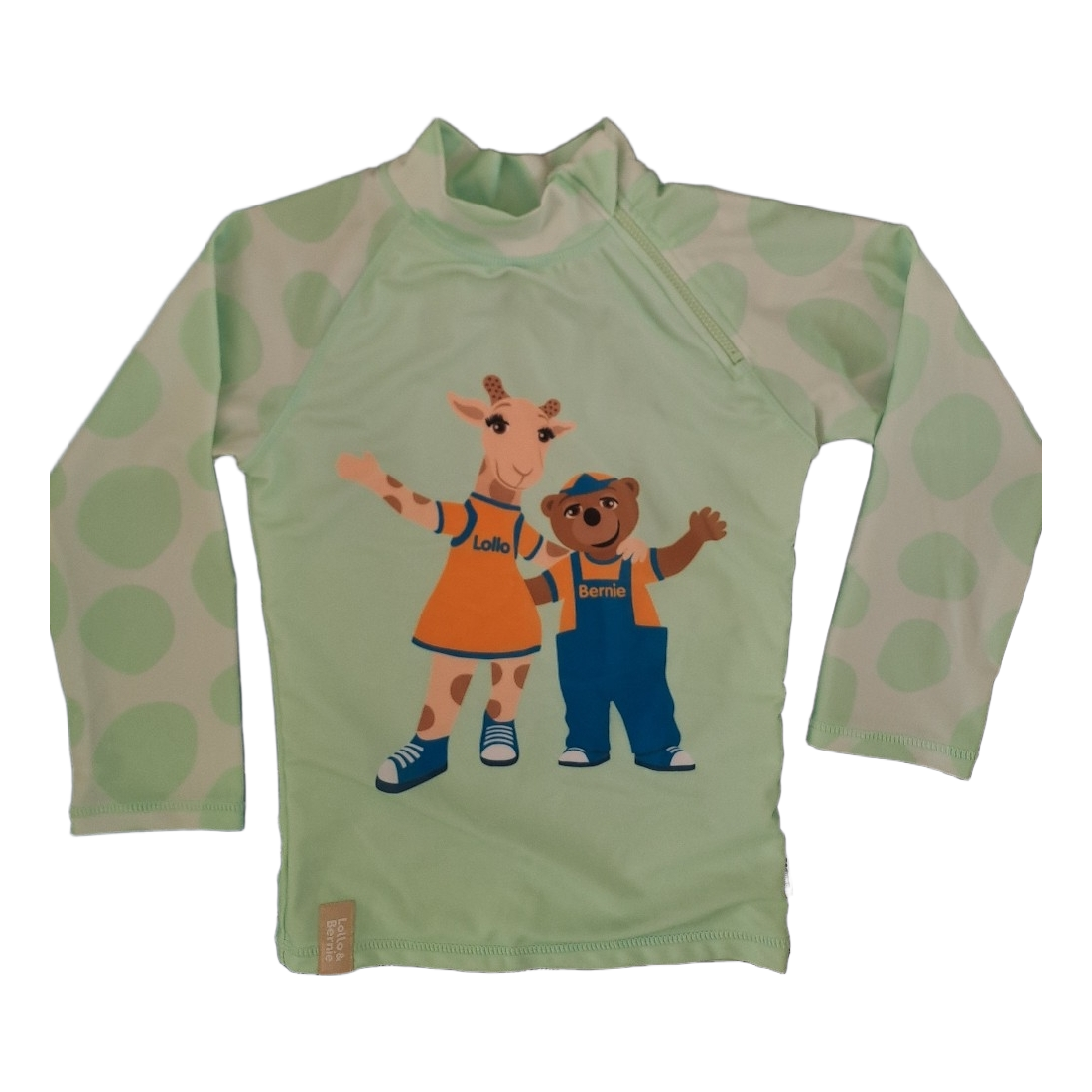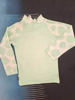 Green long-sleeved swimming shirt with graphic print. Featuring a zipper at the neckline. Made of polyester and elastane, size 110-116 CL.