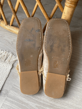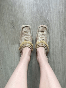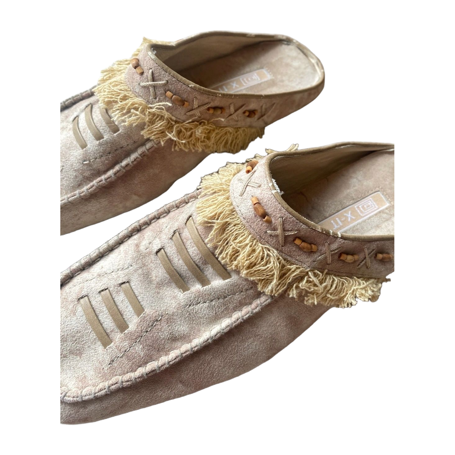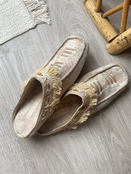 Magnificent suede leather vintage loafers for festivals and other summer outings - size approximately 37 - shade a beautiful warm beige - wooden button decorations and fringes decorating the edges - surface 100% suede 🤎