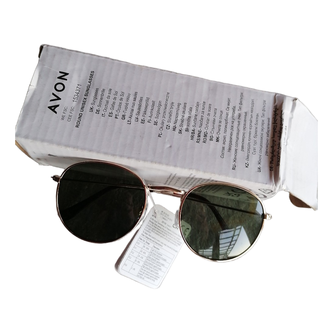 Round Avon sunglasses. Includes original packaging.