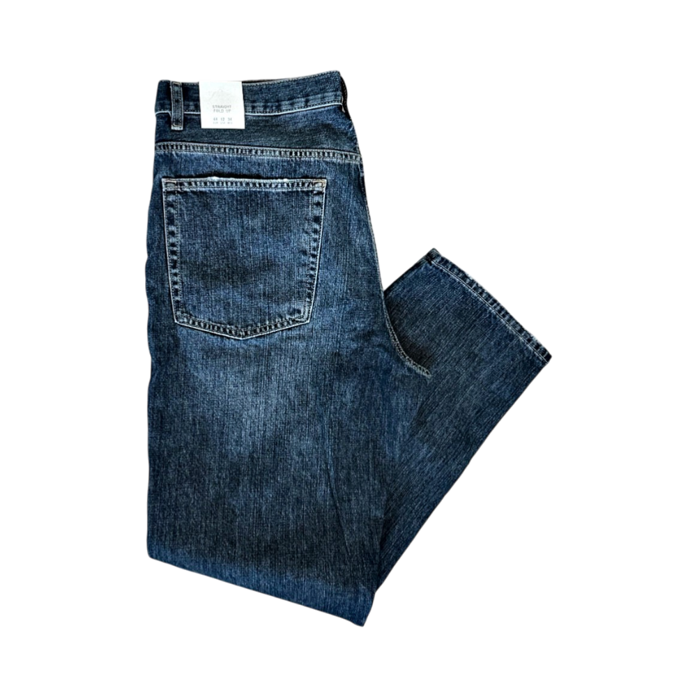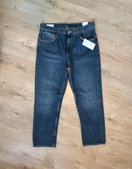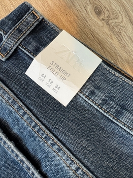 Blue jeans, with a straight "fold-up" leg. The trousers have zipper and button fastening and back pockets. Sales tags are attached.