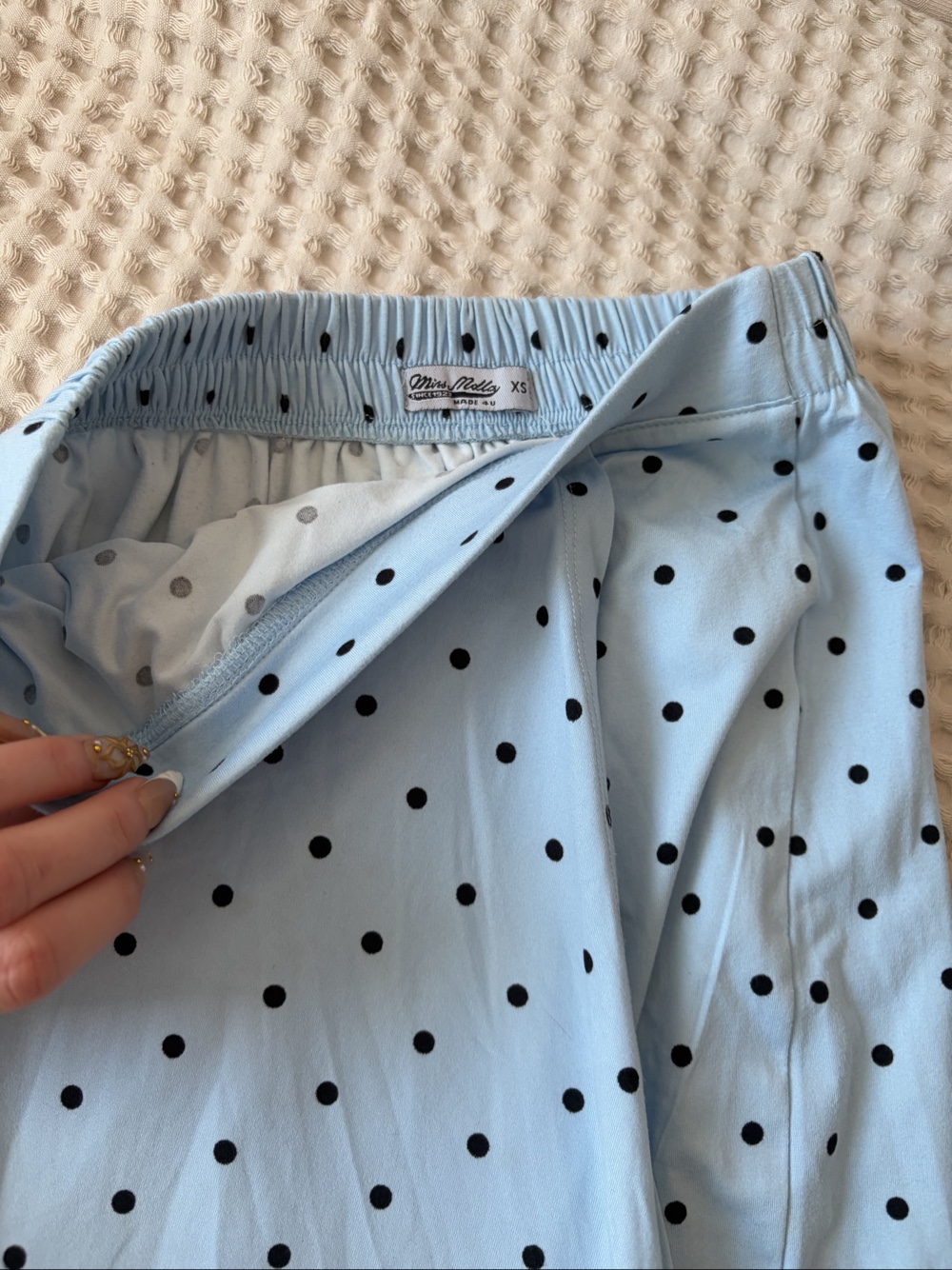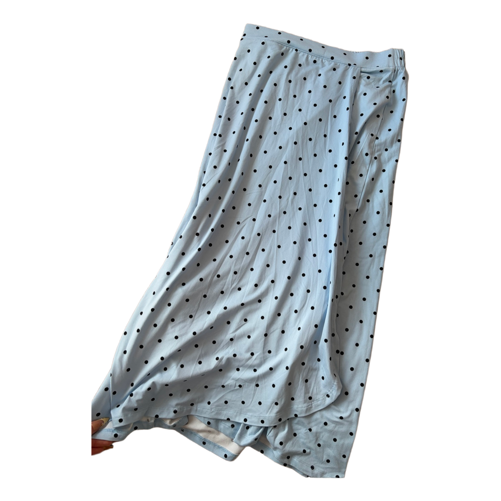 Light blue midi skirt with a black polka dot pattern. Features an elasticated waist and a wrap-style front. Size XS.
