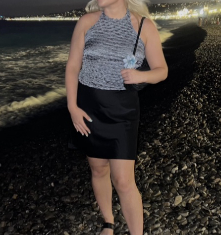 Creased halter top with raised design. Beautiful metallic blue silver-ish color. 🩵 Very strechy material!