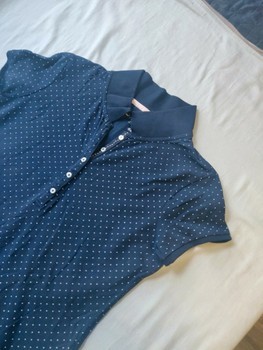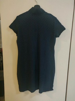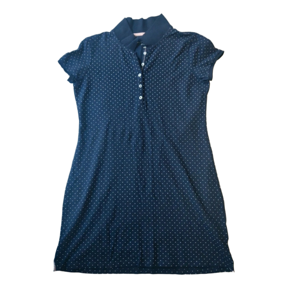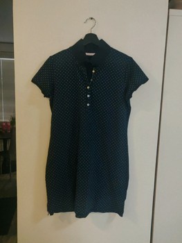 Very neat and in good condition dark blue short-sleeved polo dress. The dress has a white polka dot pattern and a buttoned collar.
