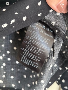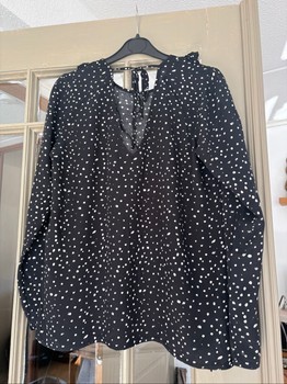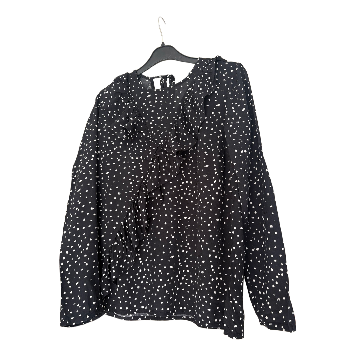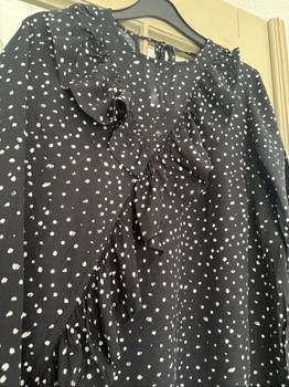 Esmara black-and-white polka-dotted blouse. Asymmetric ruffle at front, ties at the neck. Light, pleasant viscose material. Size S. In good condition, no faults to note.