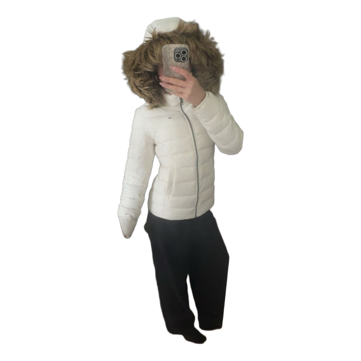 White quilted jacket with a fur-trimmed hood and zipper closure. Features a Tommy Hilfiger logo on the chest.