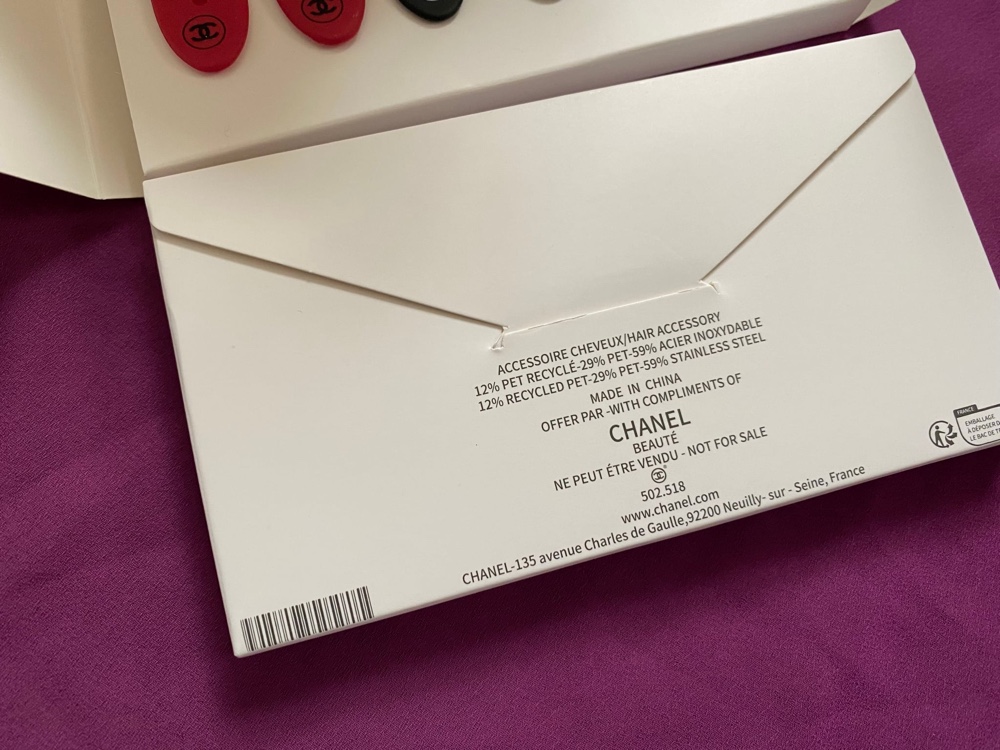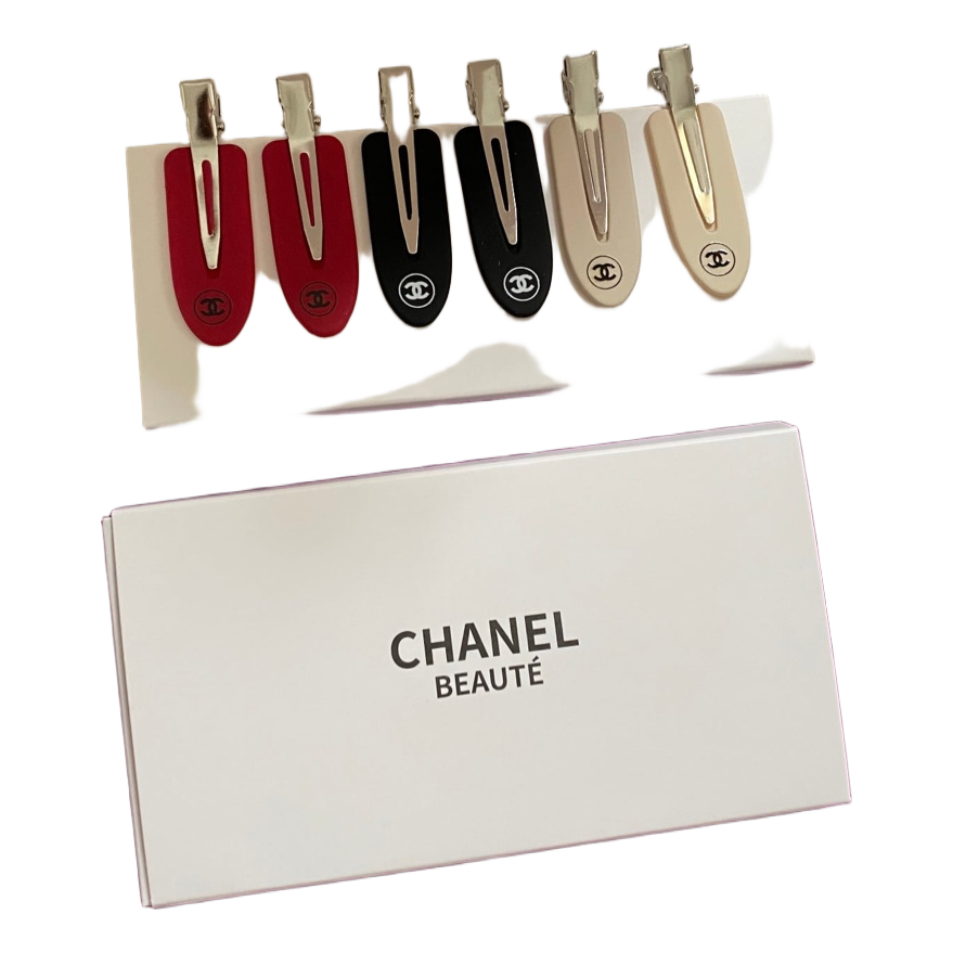 Set of six branded Chanel hair clips in a gift box. Includes red, black, and beige colors.