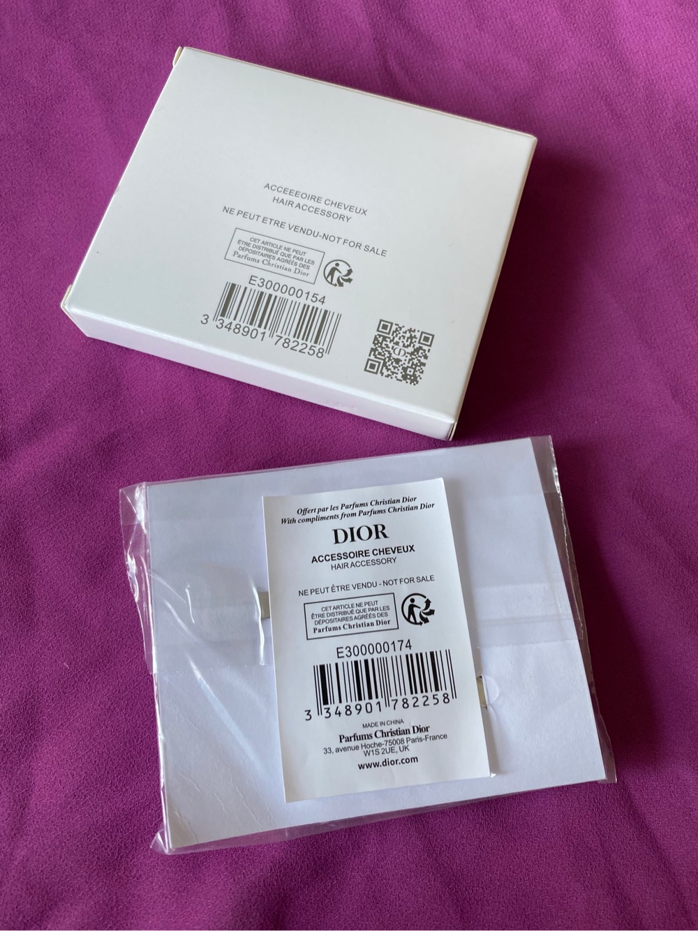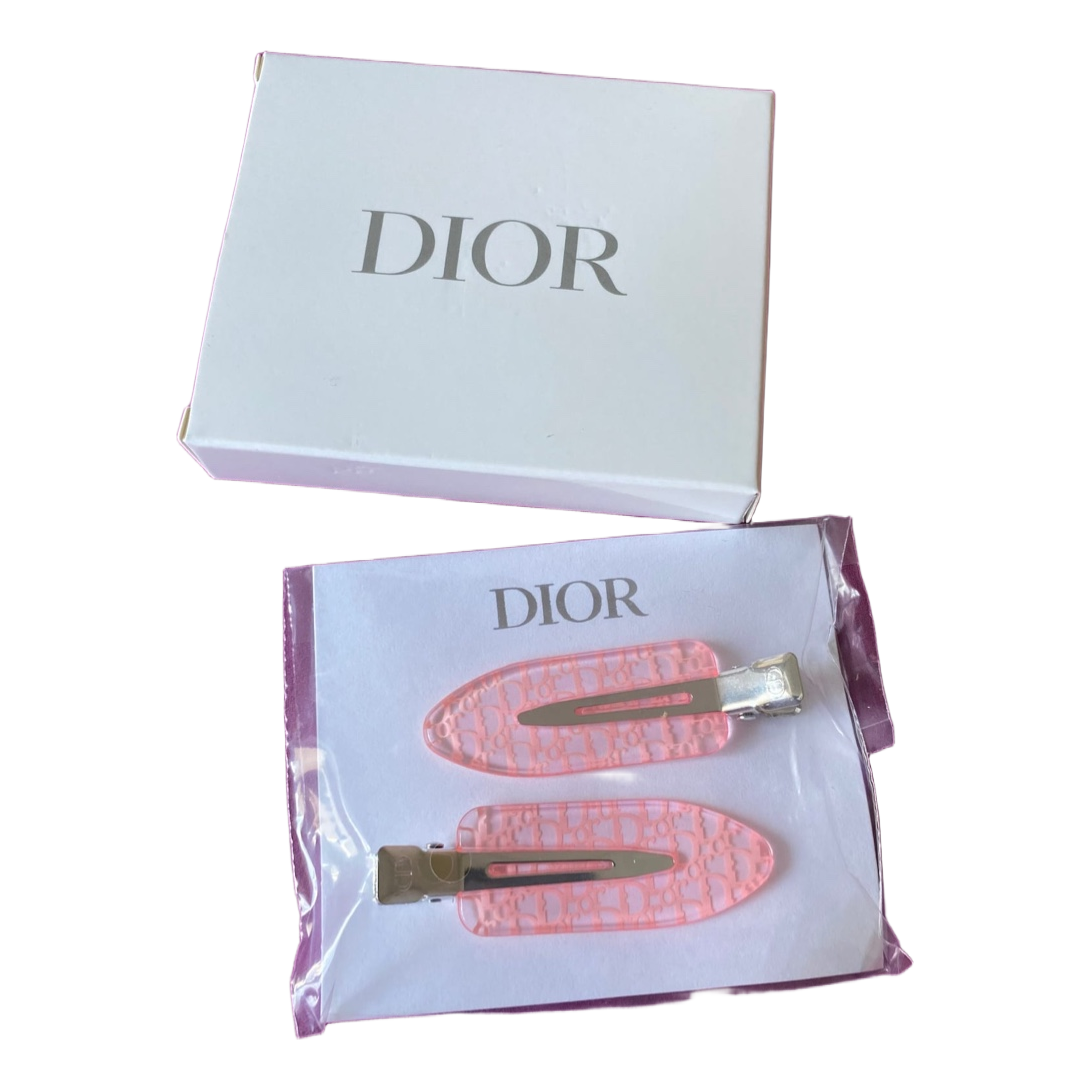 Set of two pink Dior hair clips with logo pattern. Comes with original packaging.