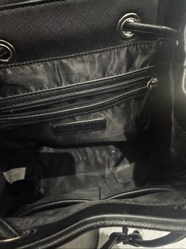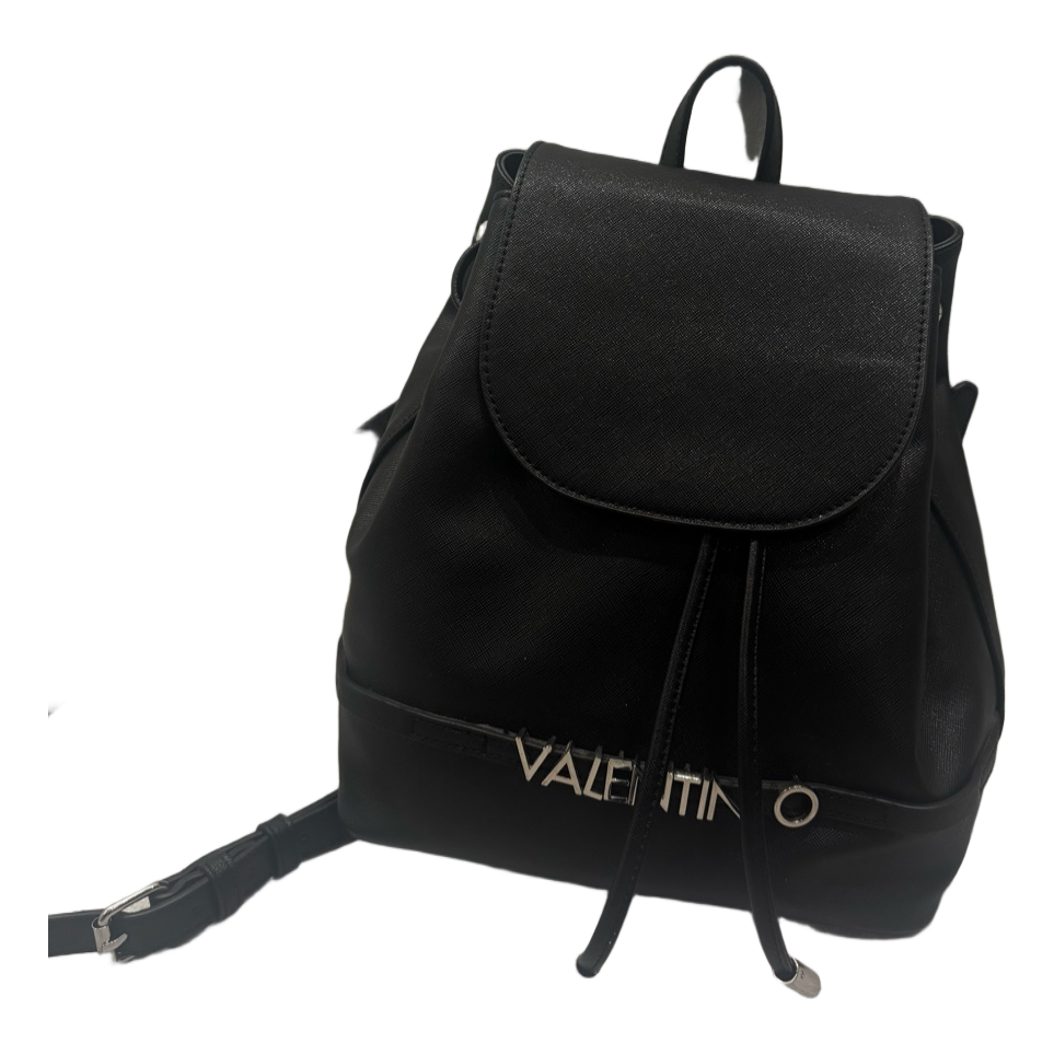 Black backpack featuring the brand logo in silver hardware. Includes a drawstring closure, flap top, and adjustable shoulder straps.
