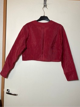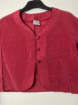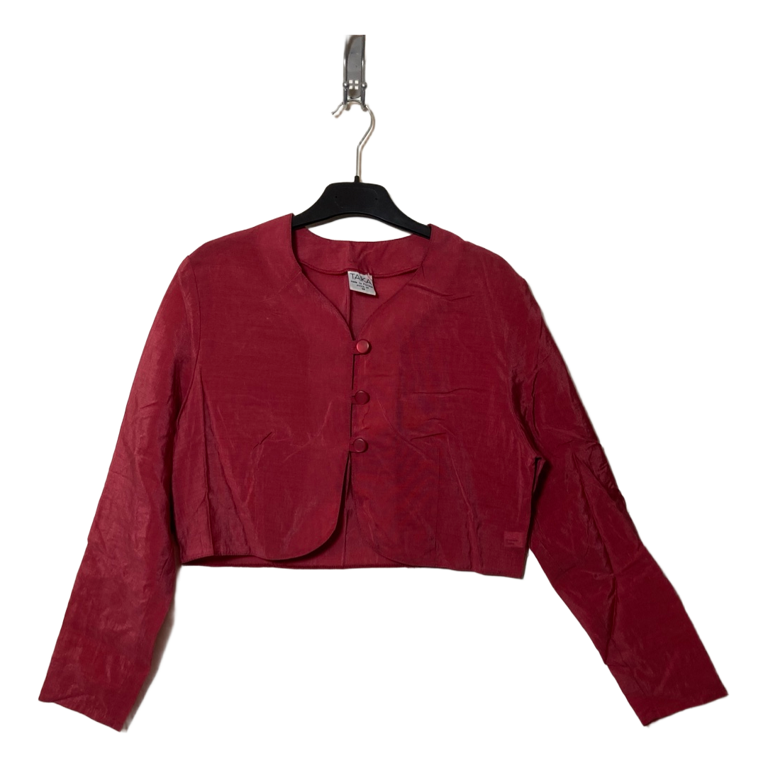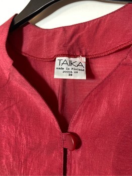 Taika wine-red very thin bolero-type jacket. Fastening with shiny buttons. Excellent condition. Made in Finland. High-quality, very thin and slightly shiny fabric. Slightly translucent, lightweight and crisp fabric. 80% viscose/rayon and 20% polyamide. Size 38. Underarm-to-underarm measurement about 50 cm. Length about 45 cm. Sleeve length from underarm about 42 cm.
