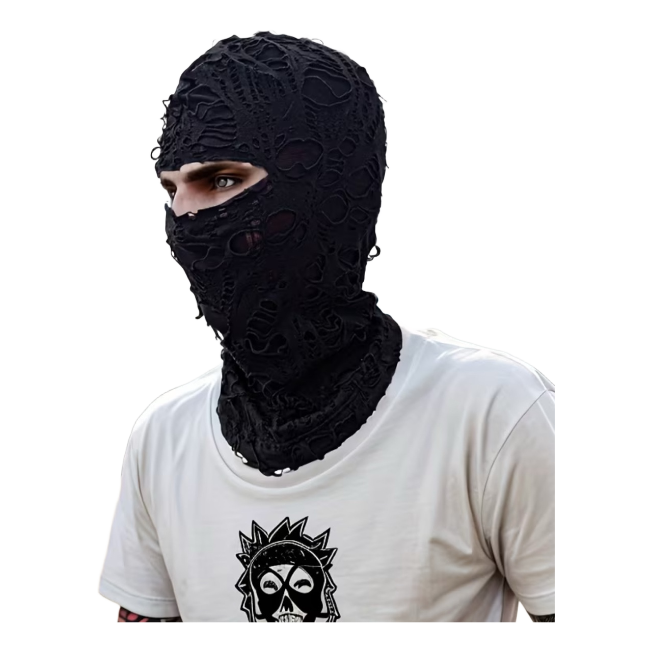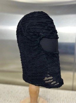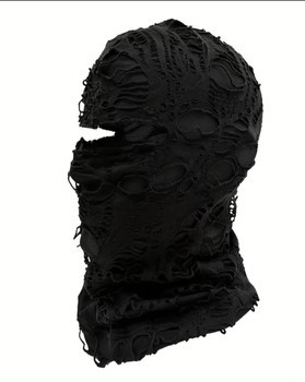 Black balaclava with a heavily distressed, shredded design. Features a single opening for the eyes.