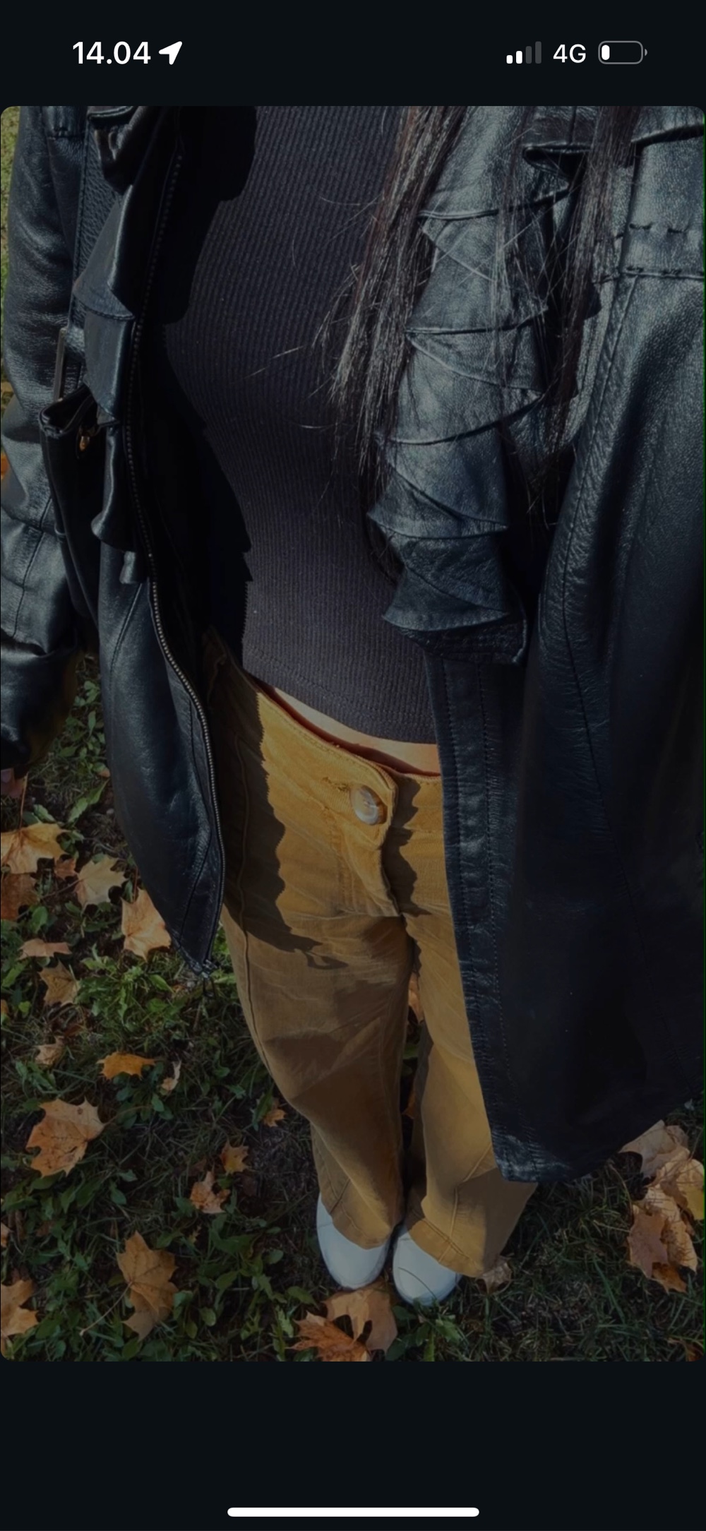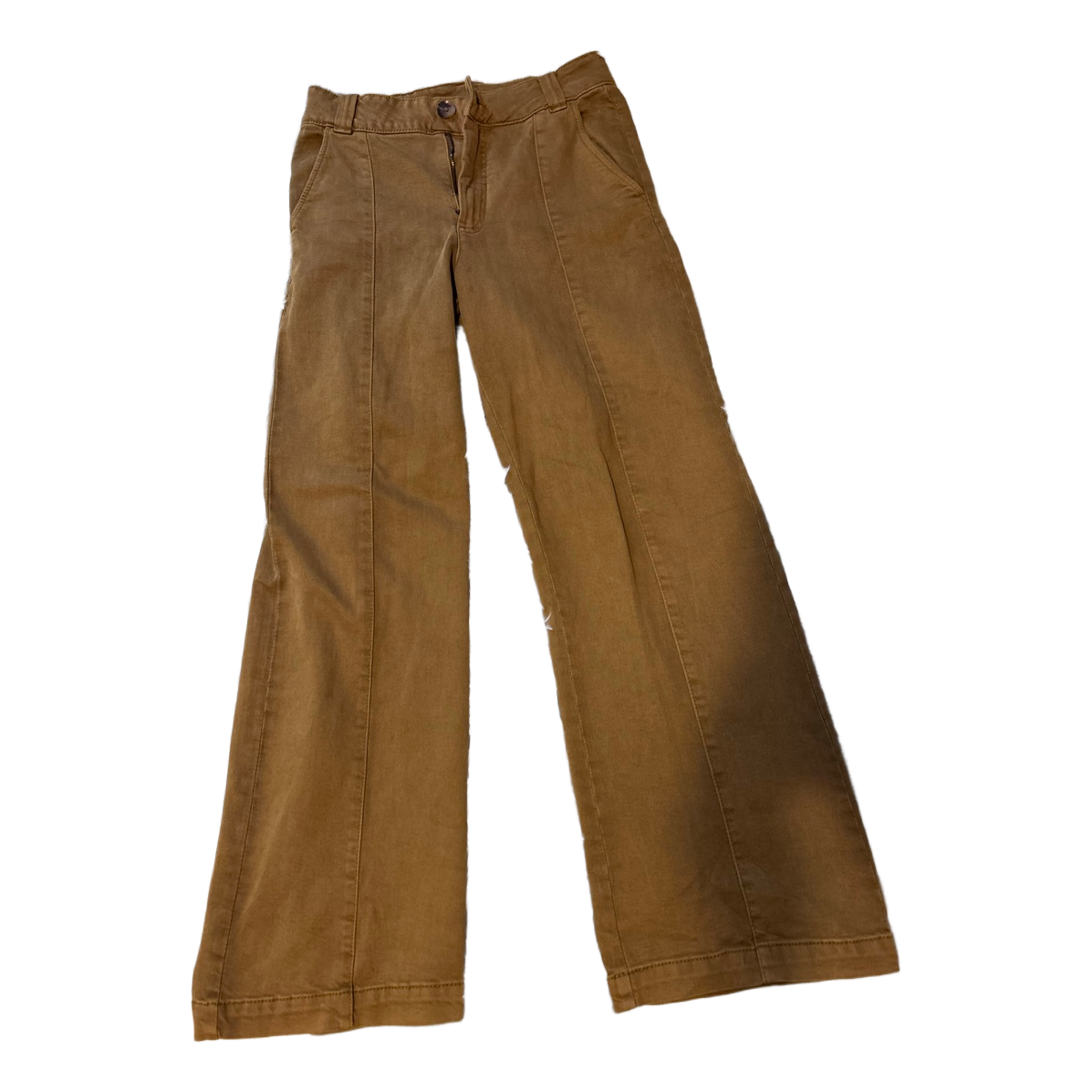 Brown jeans with a wide-leg fit and centered vertical seams. Featuring a button and zip closure.