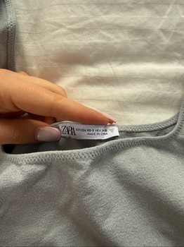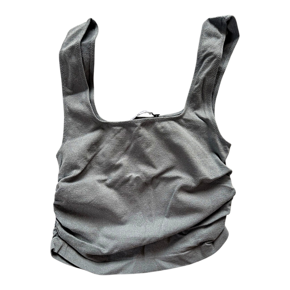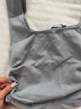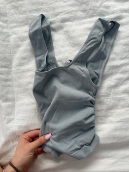 Grey shimmery top with a square neckline. Features ruched detailing on the sides.