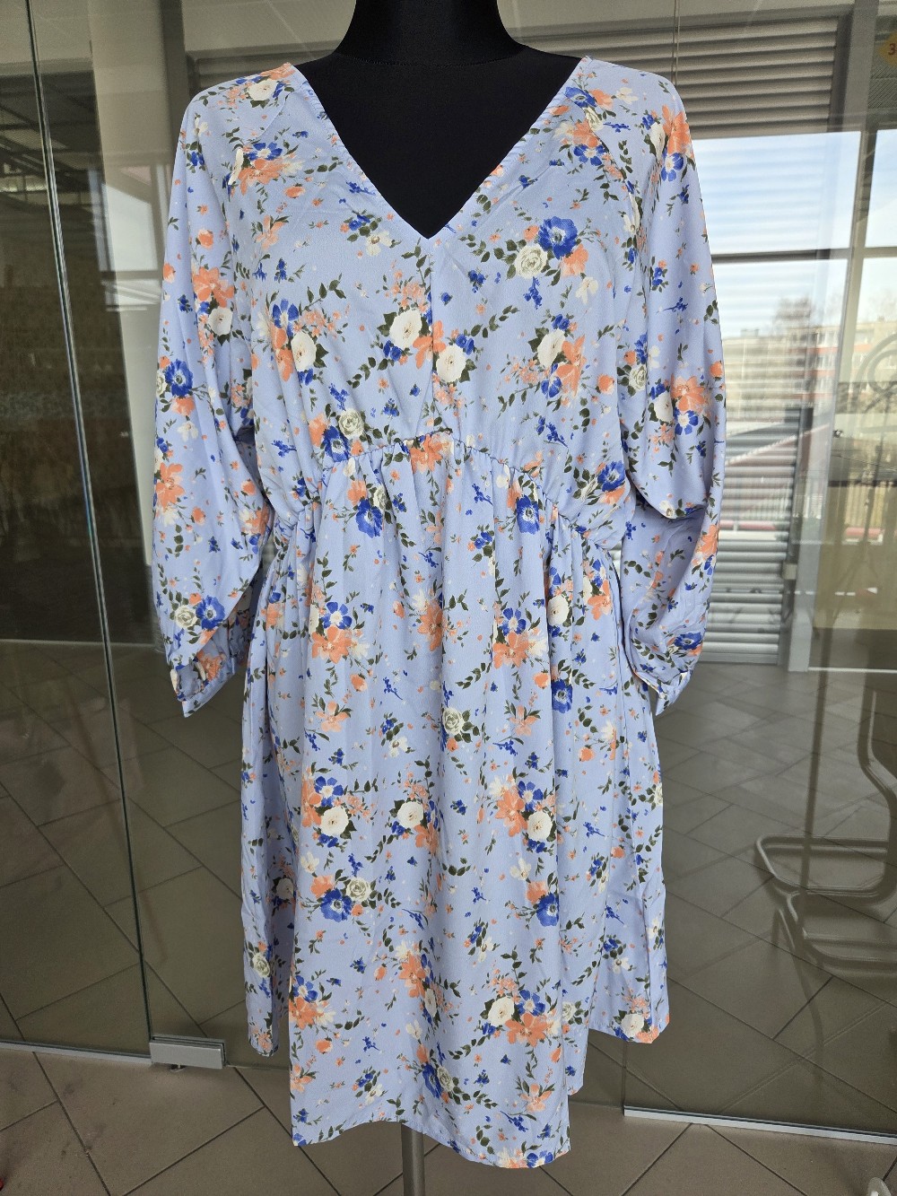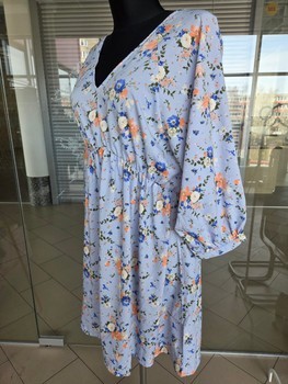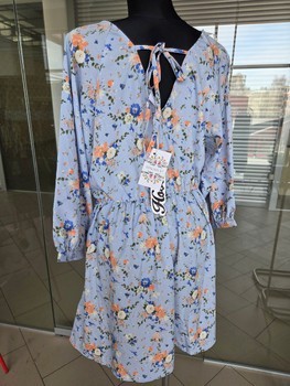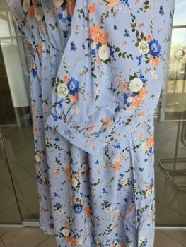 Floral print dress in light blue. Features 3/4 sleeves and a tie detail at the back. Made of 100% polyester. Size 14.