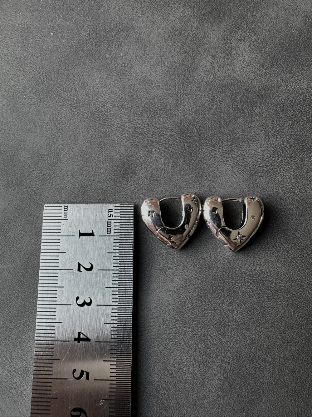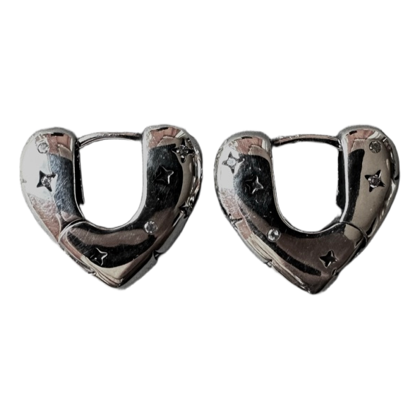 Silver-toned heart shaped hoop earrings with small star and dot detailing.