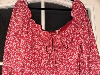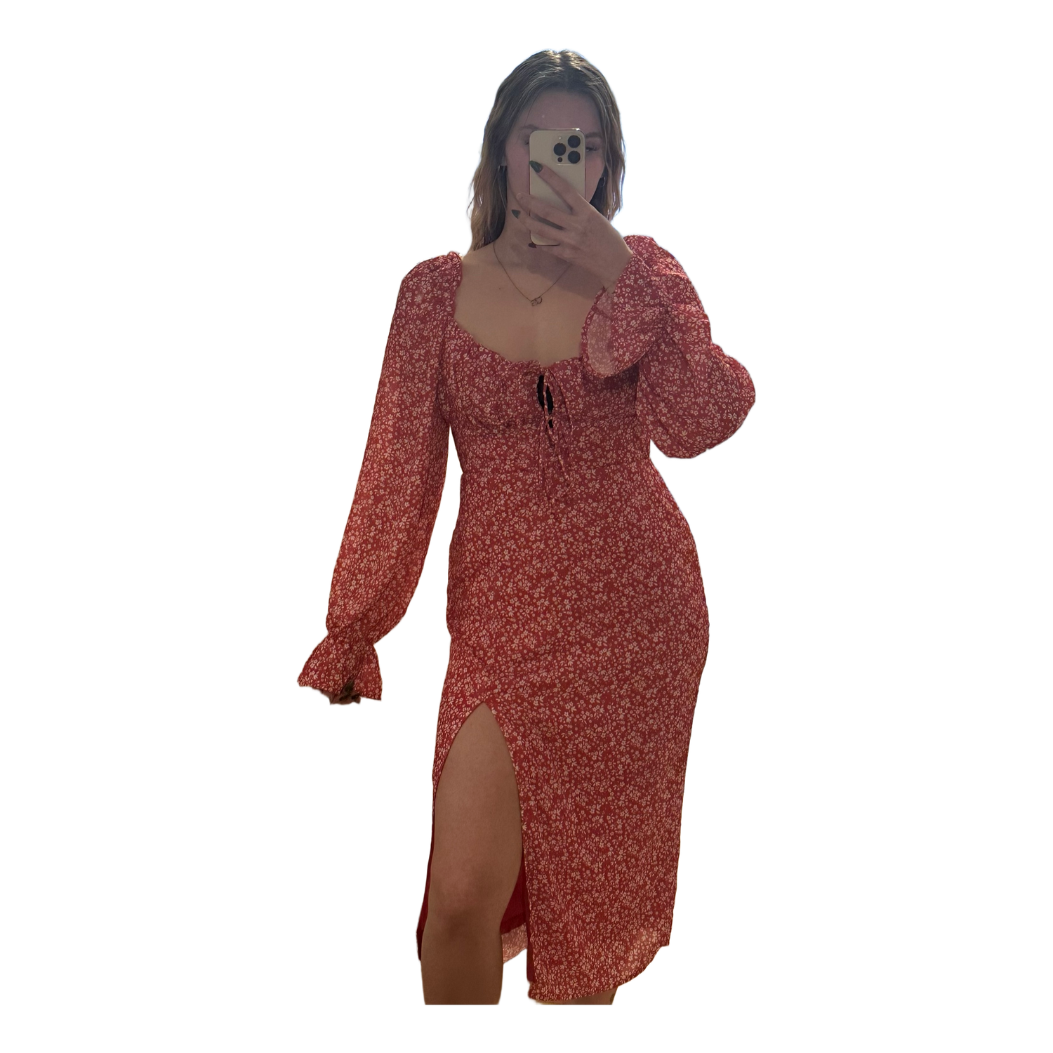 Red midi dress with a white floral pattern, featuring long sleeves and a front tie detail. Includes a side slit. Size 40.