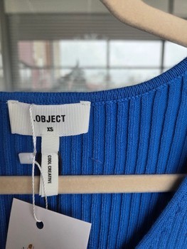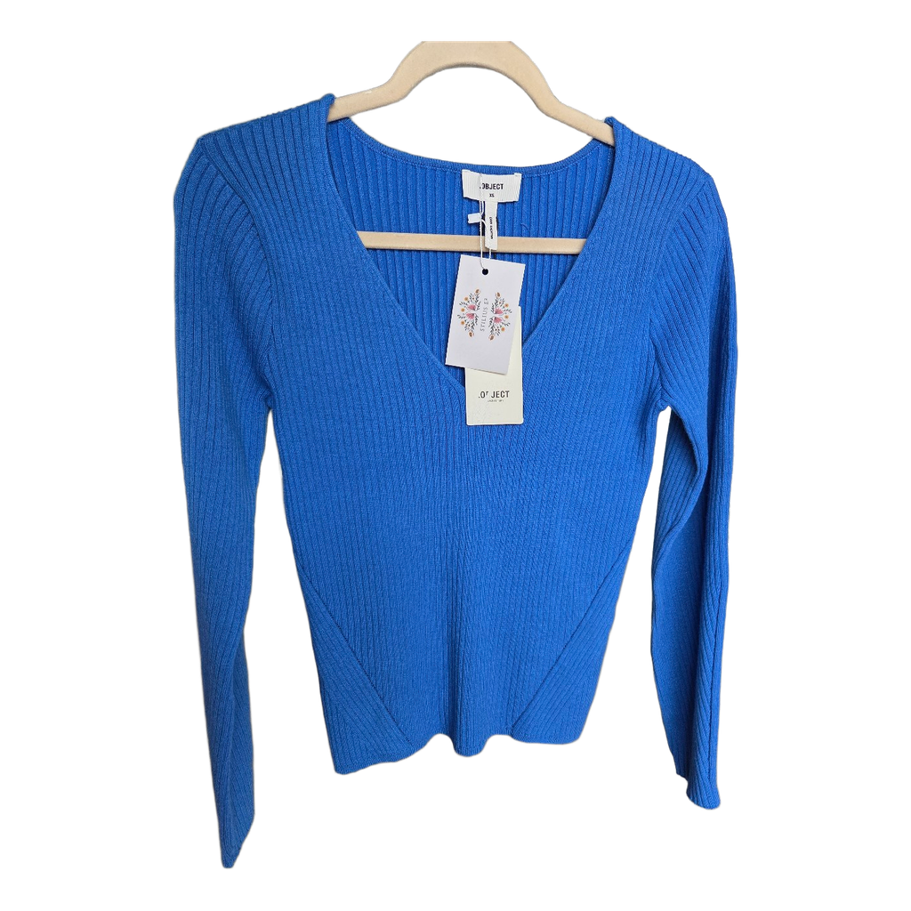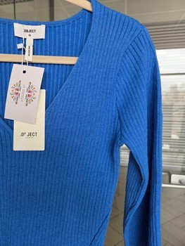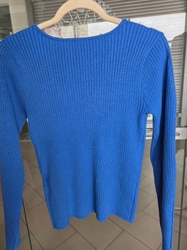 Ribbed knit jumper with long sleeves and a V-neckline. Blue color, size XS. New with tags.