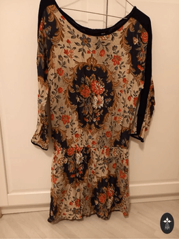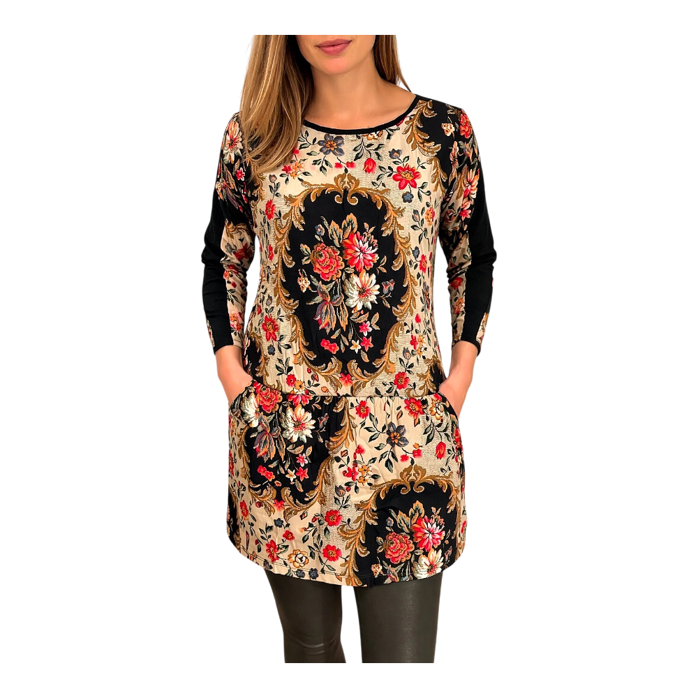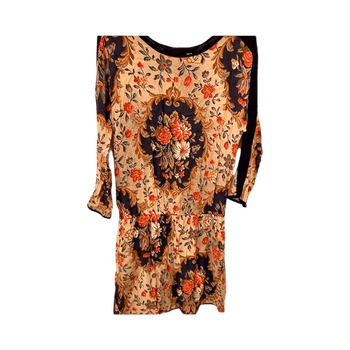 Dress featuring a floral design with a black trim and 3/4 sleeves. Designed with a relaxed fit and knee-length silhouette.