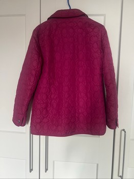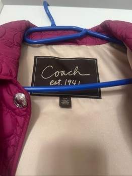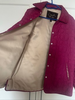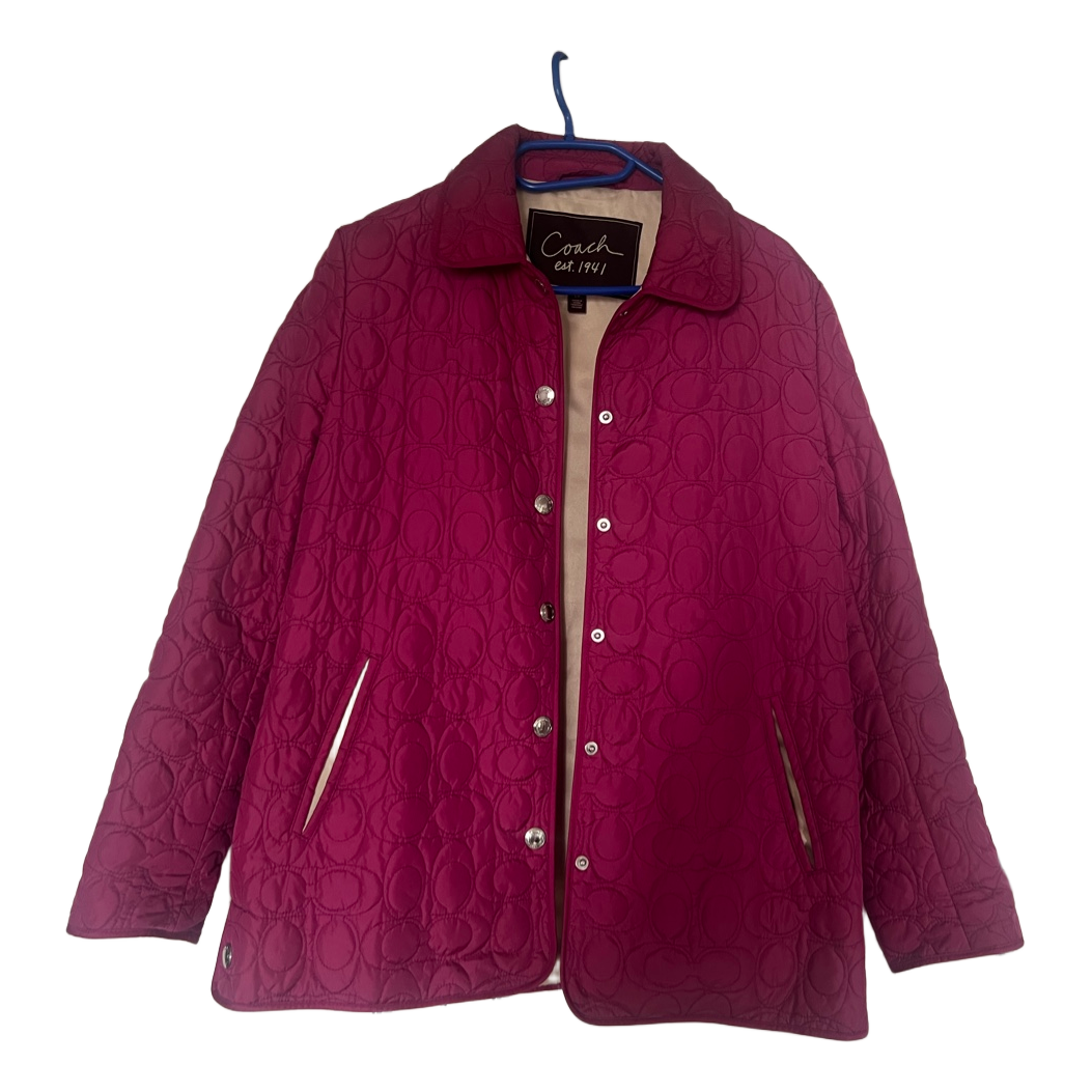 Quilted vintage Coach jacket in pink with snap button closure. Features signature embossed pattern and a light-colored lining. Size S/P.