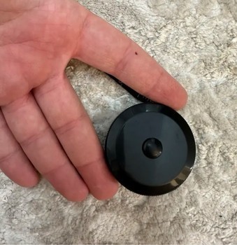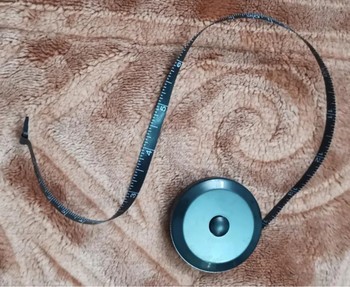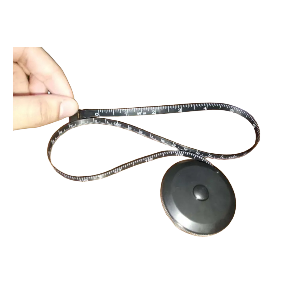 Black retractable measuring tape with a 60 inch length. Compact design, easy to hold.