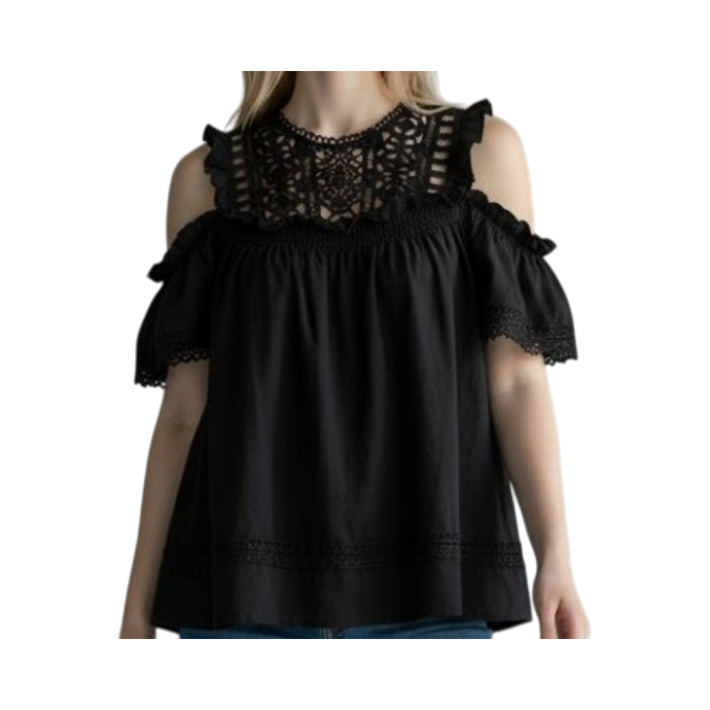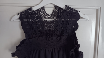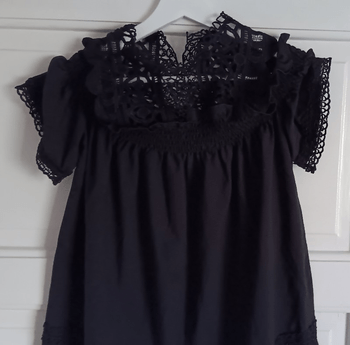 Lace upper part, cold-shoulder model, lightweight material. Slightly flared downward model. Black, M