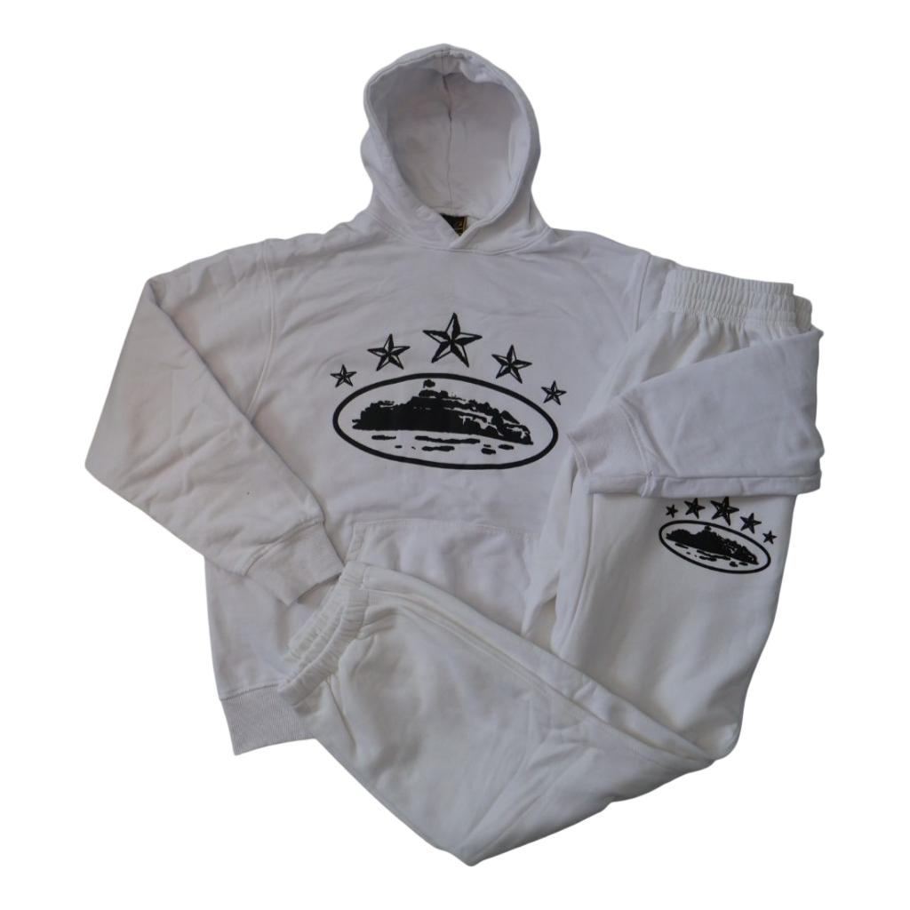 For sale stylish and sought-after Corteiz tracksuit set (hoodie + trousers). Pure white color with black prints – really neat overall 🔥
