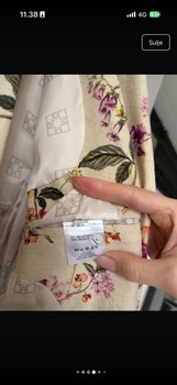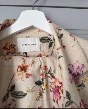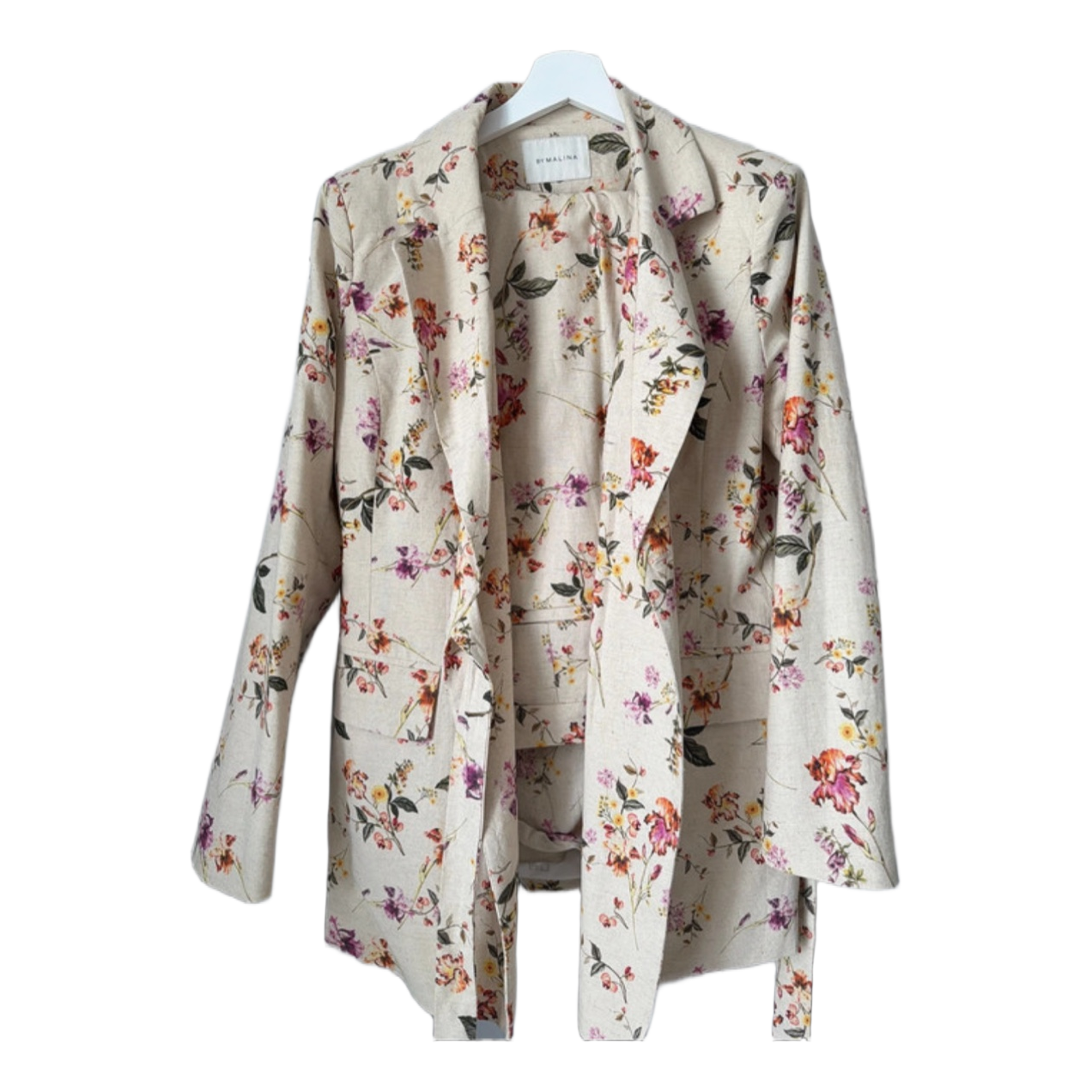 Floral two-piece suit set featuring a belted blazer and trousers. Made of a blend of linen and rayon.