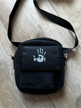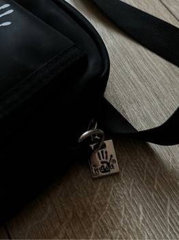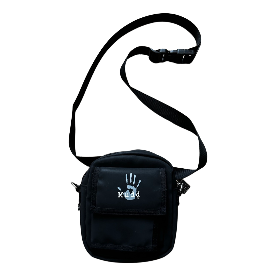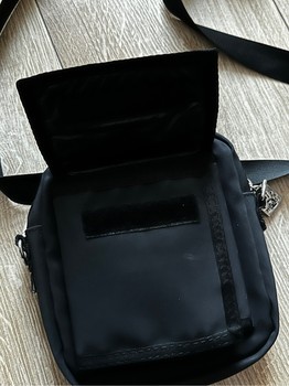Small black crossbody bag with logo detail and adjustable buckle strap. Features multiple compartments and inner zip pocket.