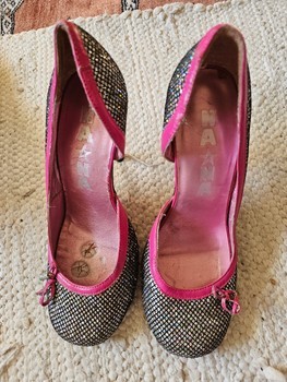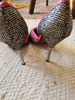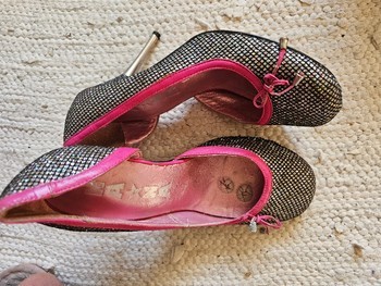 Stilettos in black glitter with pink details. The heels are metal. Colorful and eye-catching pumps with glitter and pink edge – perfect for you who love a fun and different look ✨ small flaws on the inside of the right shoe! 🔥