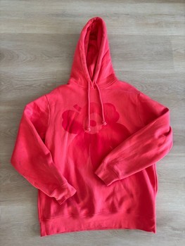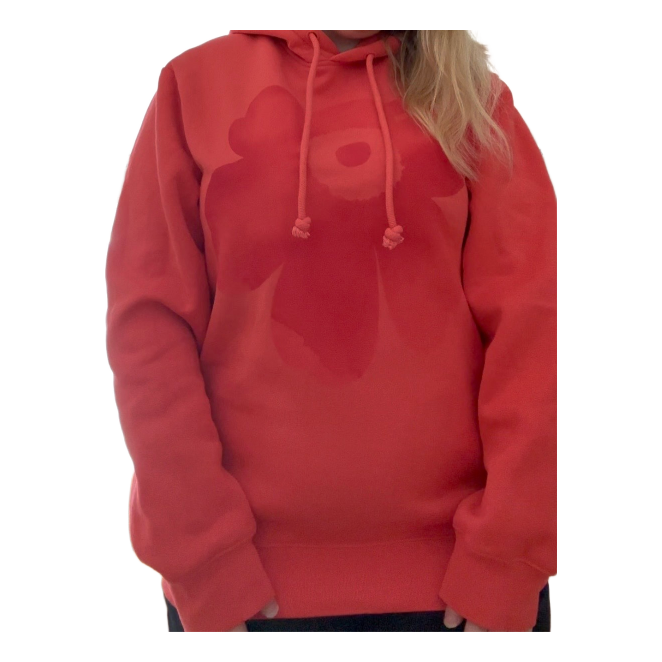 Marimekko coral-red Runoja Unikko Placement hoodie with watercolor-toned Unikko. Size M. Unisex model. Armpit-to-armpit approx. 56 cm. Shoulder-to-hem approx. 75 cm. Warm inside. Very good condition. Used a few times. No defects. RRP €240.