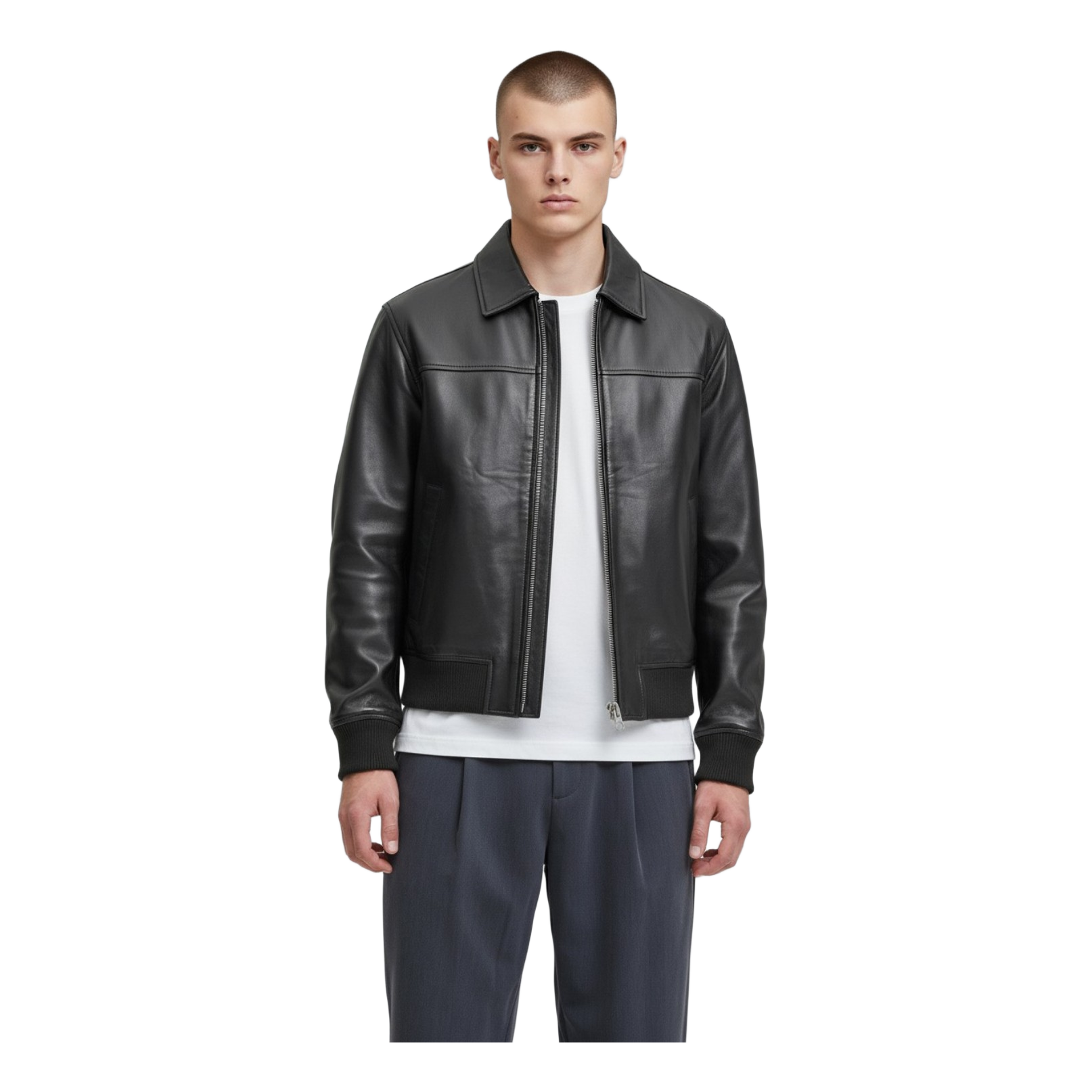 Men's black leather bomber jacket with ribbed cuffs and hem. Featuring a classic collar and front zip closure.