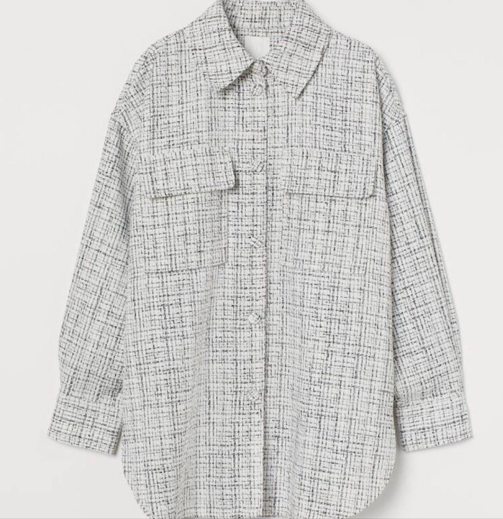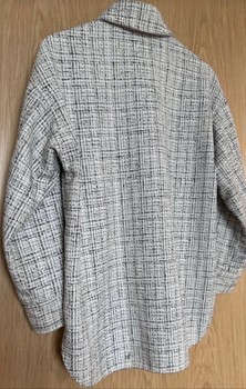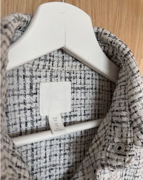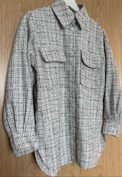 Textured tweed shirt jacket in white with black detailing. Features a collar, button-up front, and two chest pockets. Size XS.