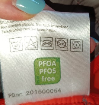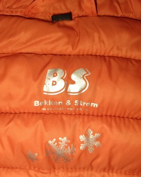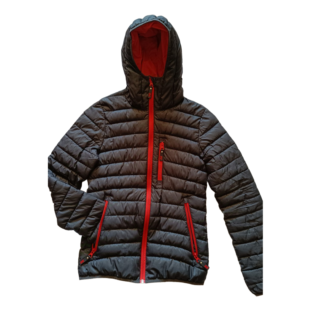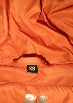 Quilted jacket with orange lining and red zippers. Features a hood and side pockets. Made of polyester, size XS.
