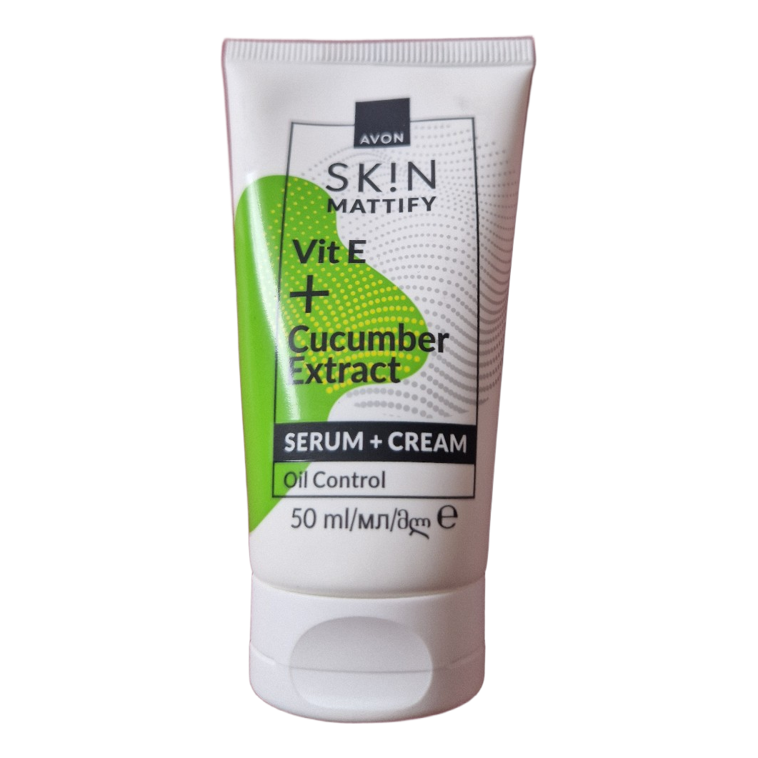 Avon Skin Mattify serum and cream with Vitamin E and cucumber extract. Features oil control formula. Contains 50 ml.