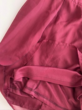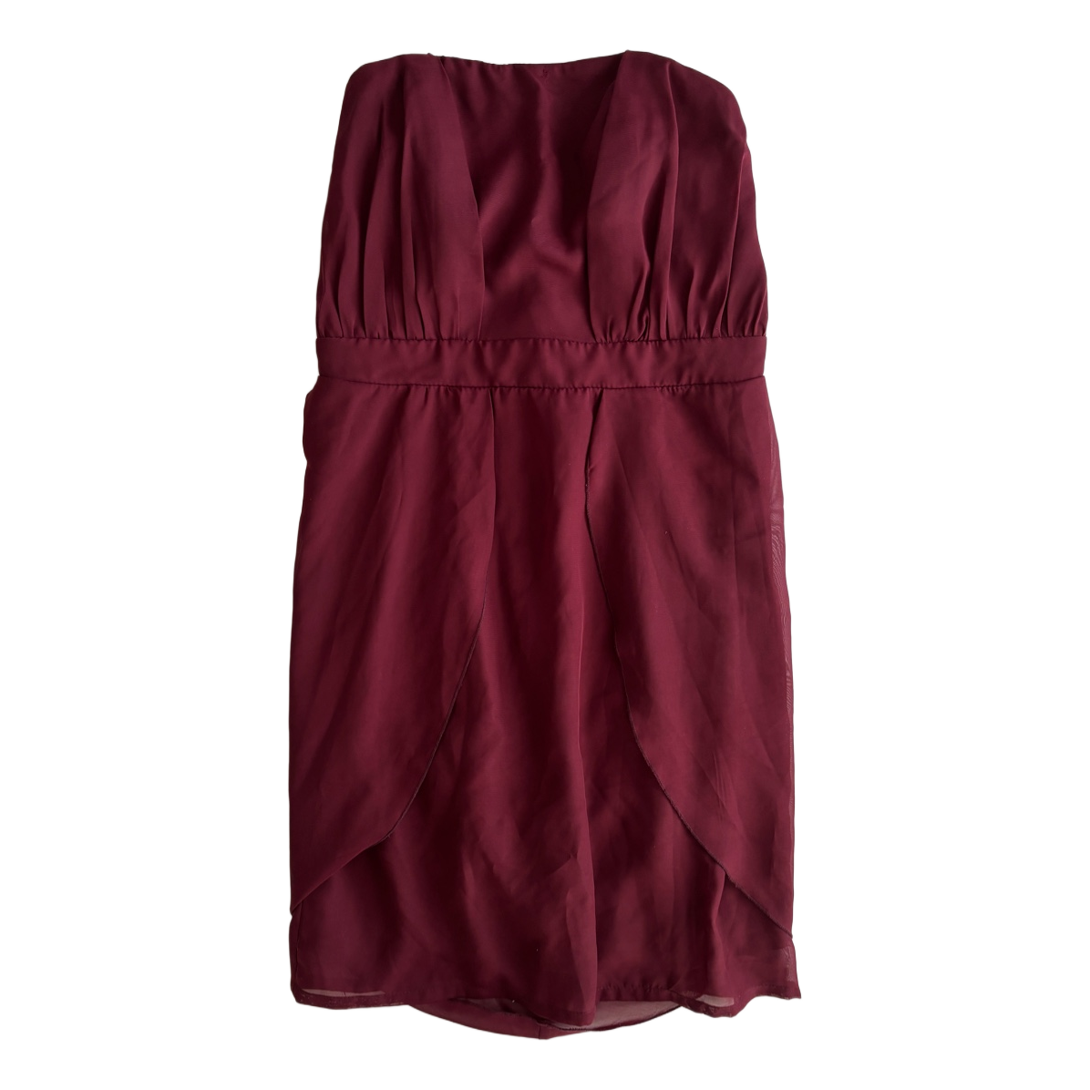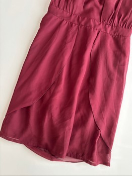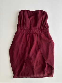 Women’s dress, party dress, graduation dress. Color wine red. Strapless dress. Back zipper to make putting on easier. Silicone band on the top that helps the dress stay up. The dress is like three layers: bottom layer thicker and non-see-through fabric + overall thin fabric + partial thin fabric. Back thin fabric pleated.