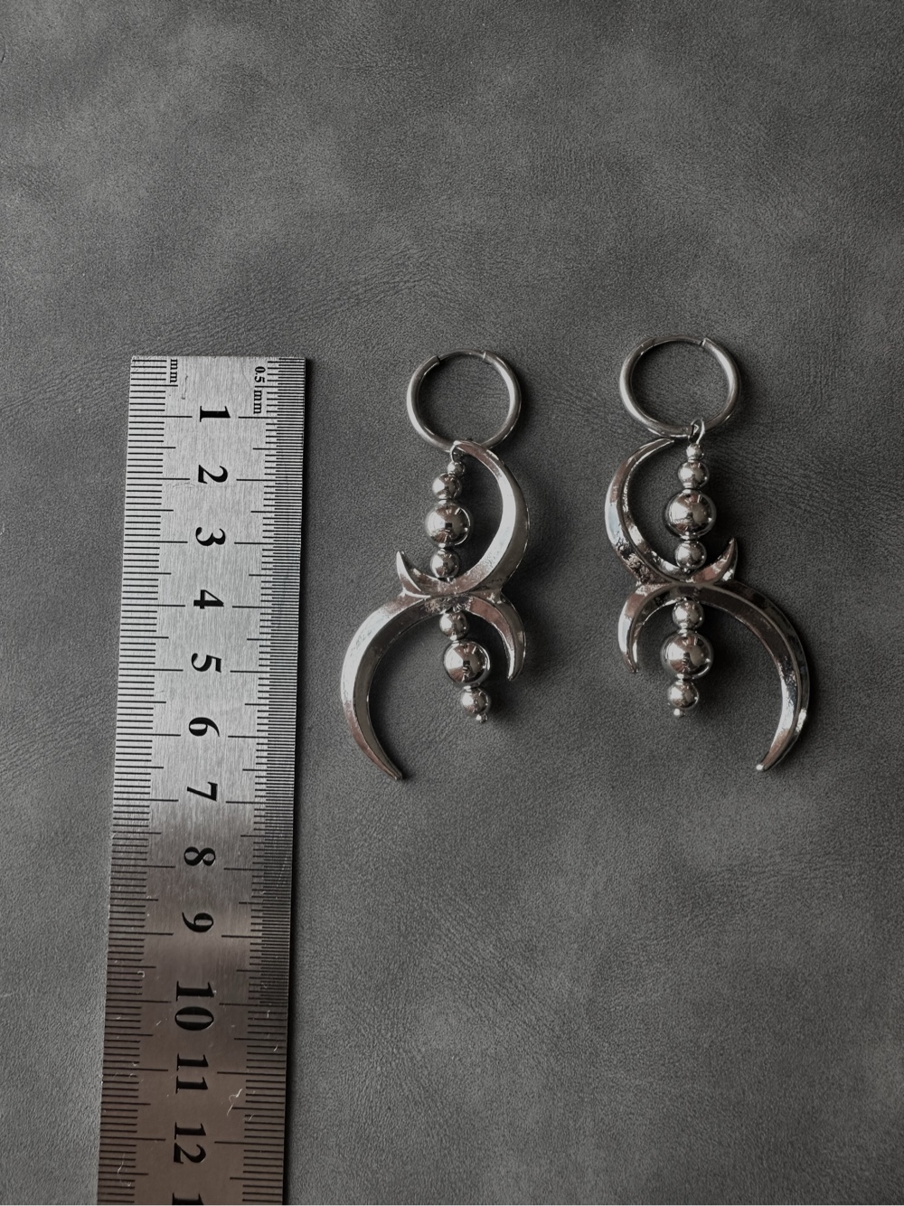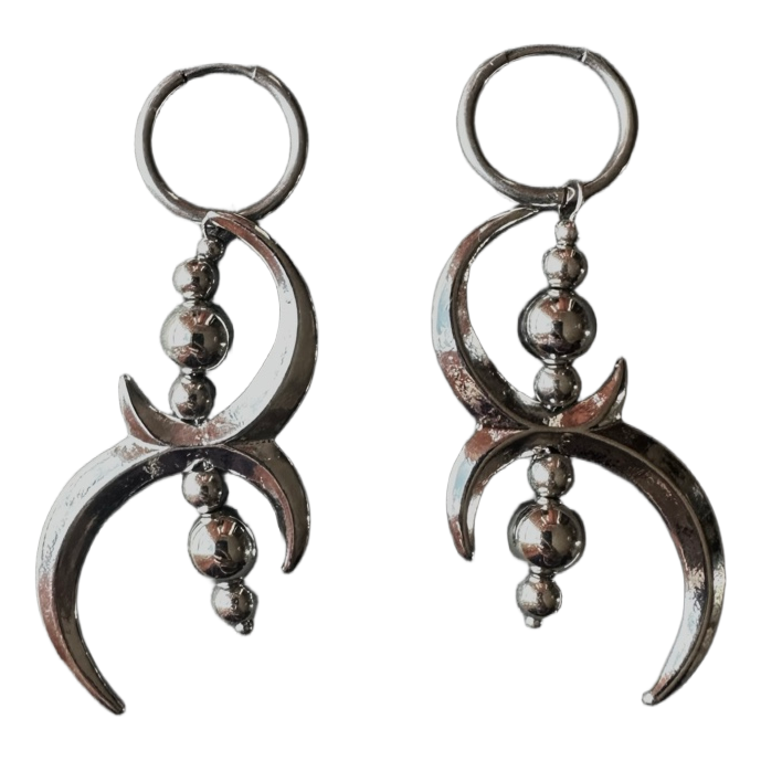 Drop earrings featuring crescent moon charms and silver-tone beads on hoops.