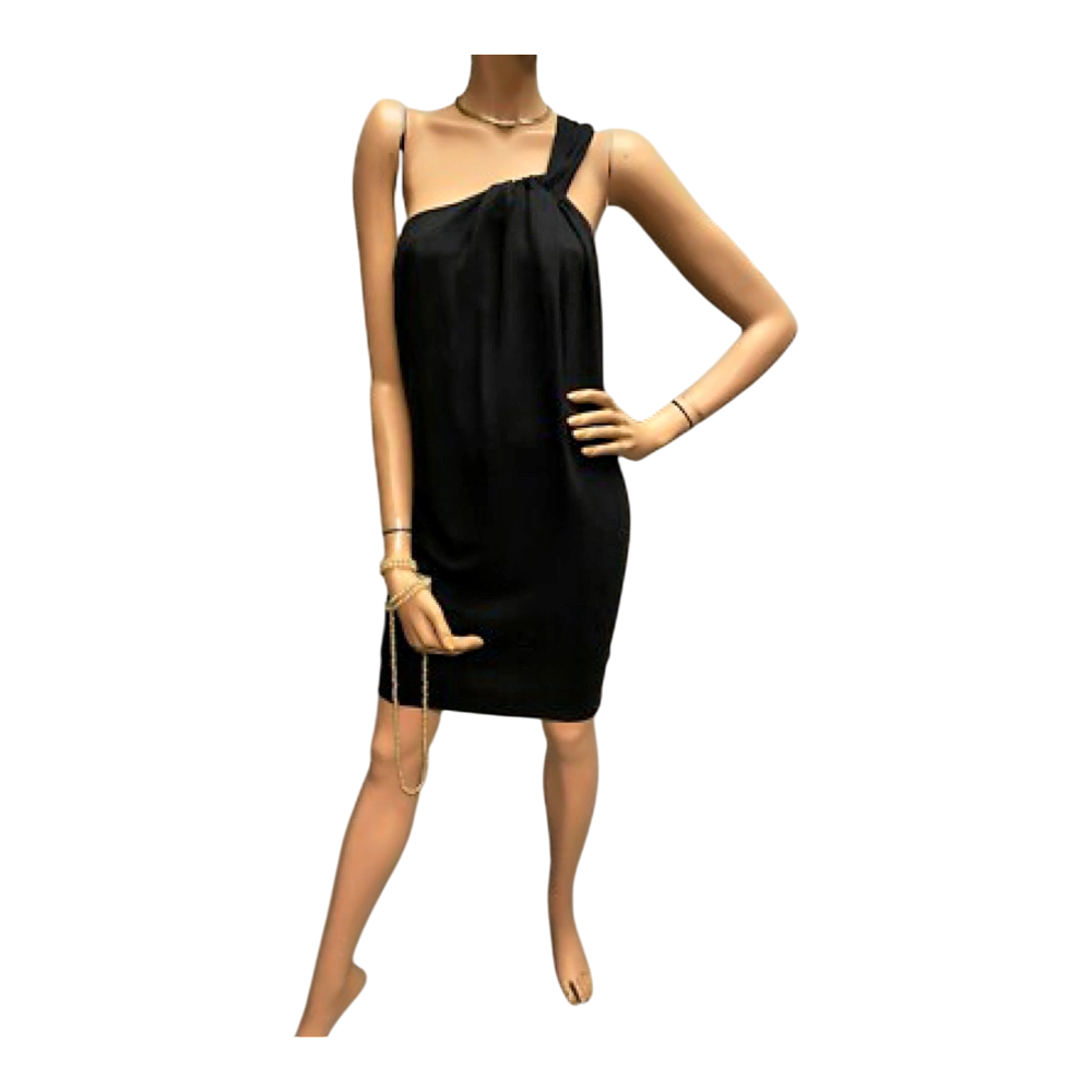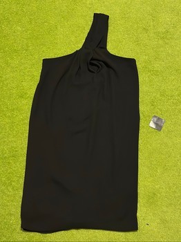 Black one-shoulder dress. Features a twisted strap design at the shoulder.