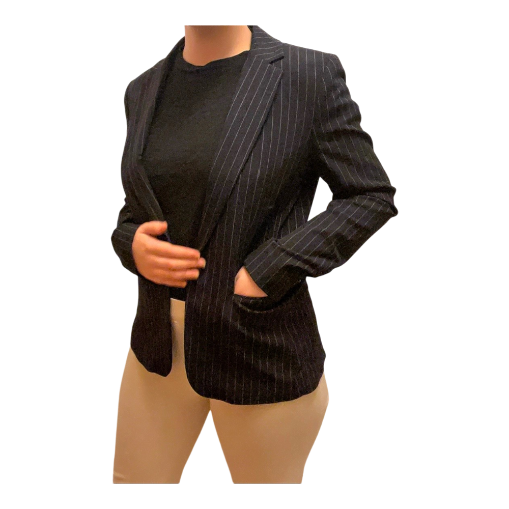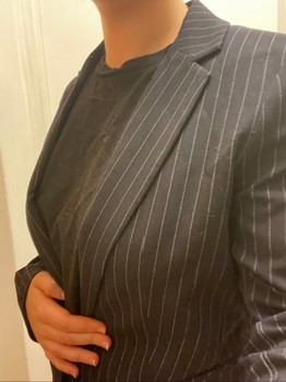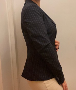 Dark blue pinstripe jacket with neat light lining and pockets. Front fastening with a hook. Brand H&M. Size marked 40. I am (in the picture) size S; on me slightly big in the shoulders.