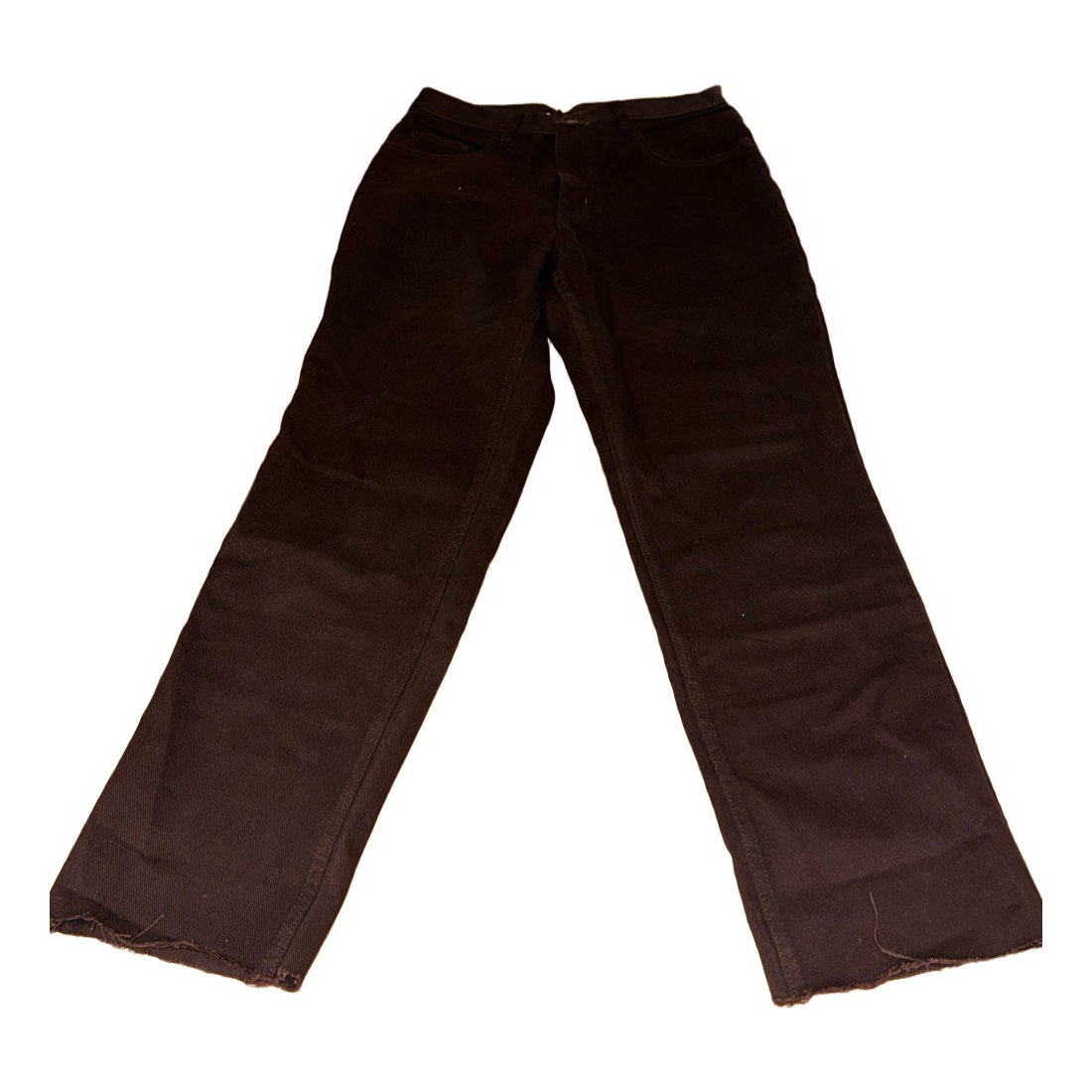 Brown denim jeans with raw hem detailing. Brand tag on the back.