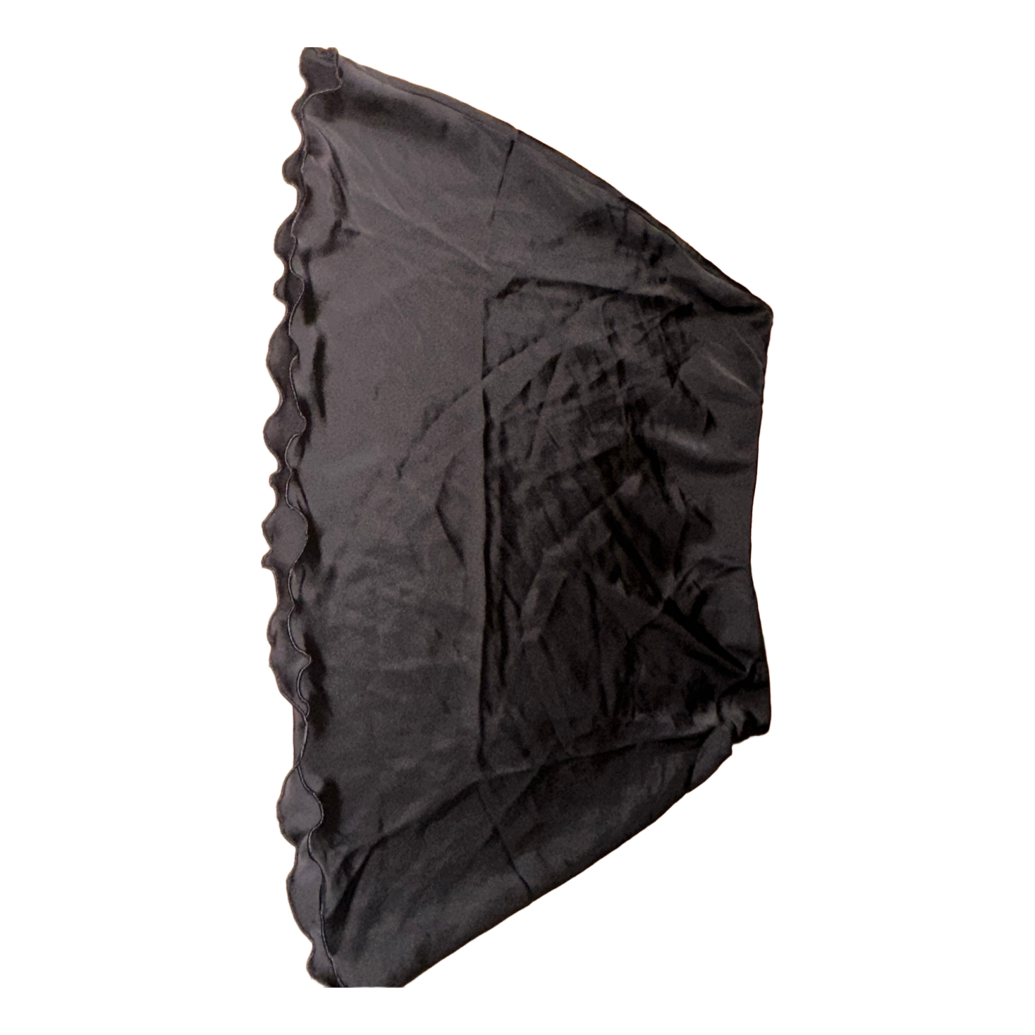 Black skirt featuring a scalloped hemline. Material has a satin-like finish.
