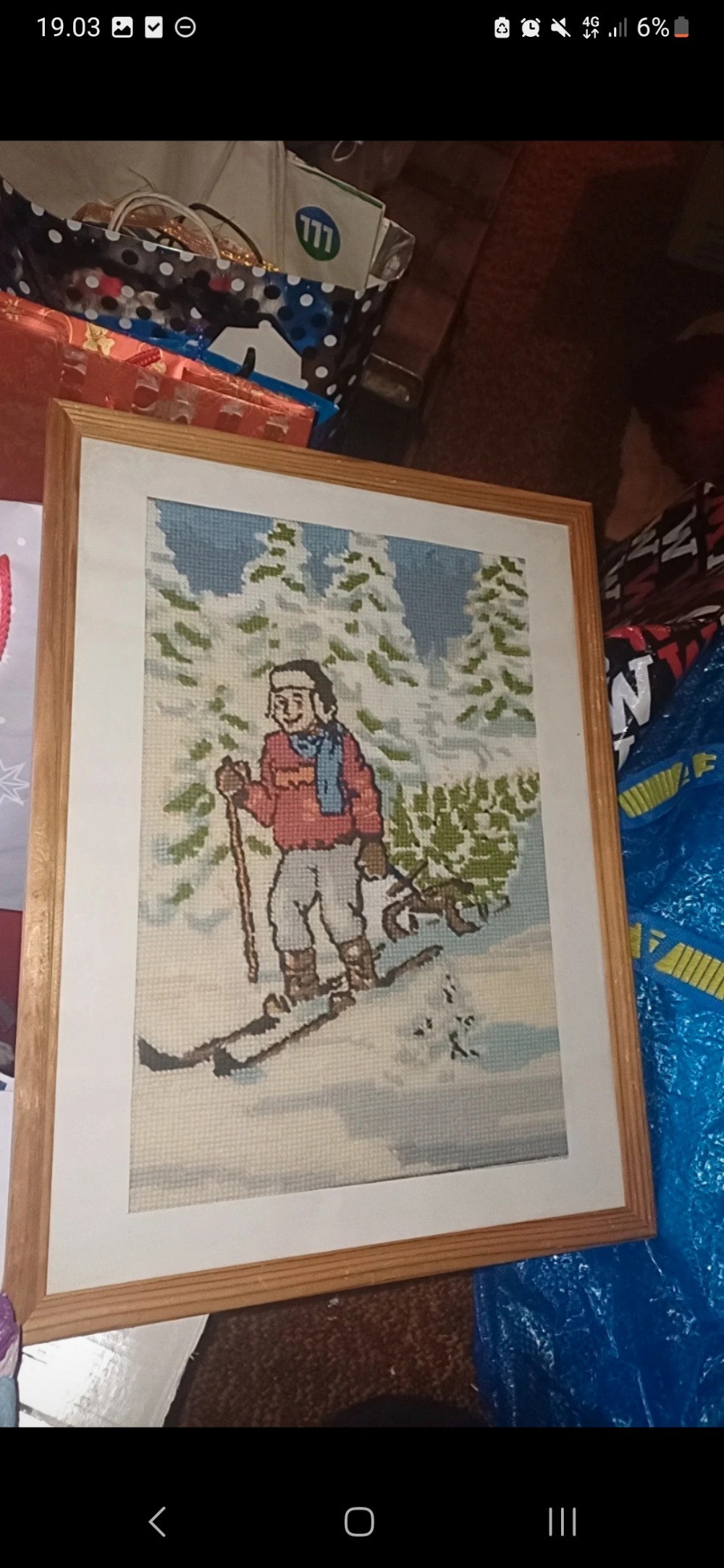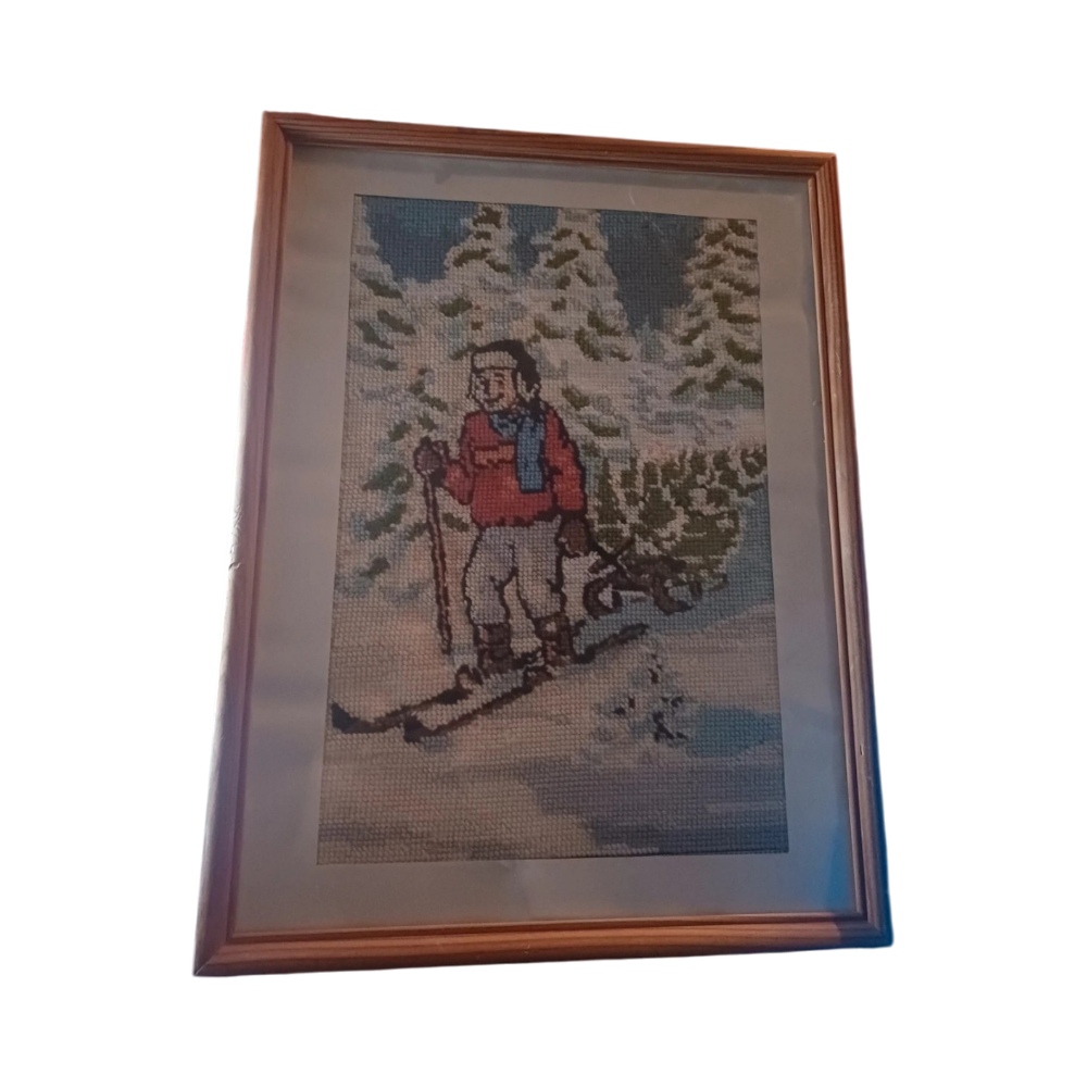 Woven picture of a winter landscape with a skier. The frame is wooden.